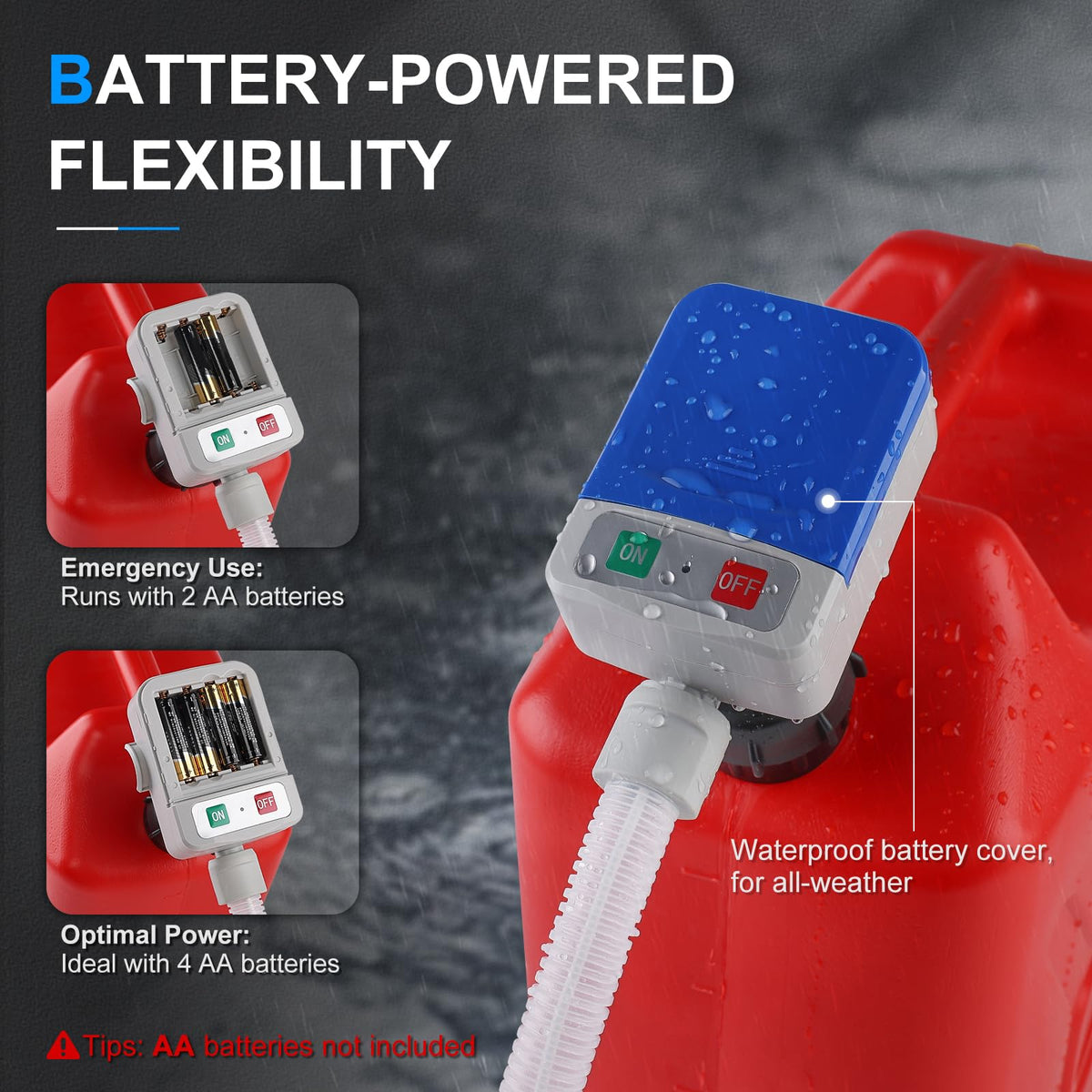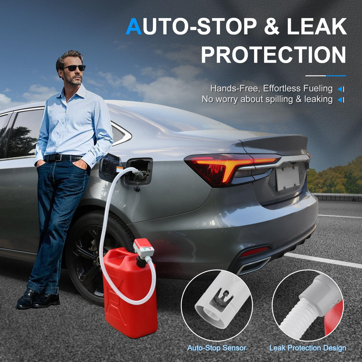 WHY CHOOSE SKYJDM FUEL TRANSFER PUMP? Emergencies With Ease: A fuel transfer pump is essential in emergencies. If you meet power outages or else, it allows you to transfer fuel from gas cans to your cars. More Efficiency & Convenience: No more lifting and holding the heavy gas cans like the manual hand pumps, saving your time and energy. The pump is built-in the auto-stop sensor feature for precise fuel transfers. EASY OPERATION & STORAGE: 1) It comes with a storage bag, and you can put the pump into it. 2) It is designed with a discharge nozzle compartment, which you can insert the discharge hose into if you don't want to store it in the bag. EASY TO USE & STORE Step1: Insert 4xAA batteries Step2: Insert the intake/discharge hose Step3: Turn the pump on, and it works well with the LED light on Step4: Store the pump in the storage bag/Insert the discharge hose into the discharge nozzle compartment The features of our fuel transfer pump! Auto-stop Sensor: The pump will automatically stop when the fuel level in the tank reaches the sensor inlet, which ensures precise fuel transfers and saves energy. Sealing Protection Design: No worry about the fuel spilling or leaking with upgraded seal leak protection. Easy to Use: Don't require manual effort like a hand fuel pump. No more lifting or holding the heavy fuel gas can, saving your time and effort. Different Applications: It comes with four different-size adapters that can be used in various containers and tanks to transfer different fuel types, such as gasoline, diesel, kerosene, and more, not for hot liquids, thinners, cresol, etc.