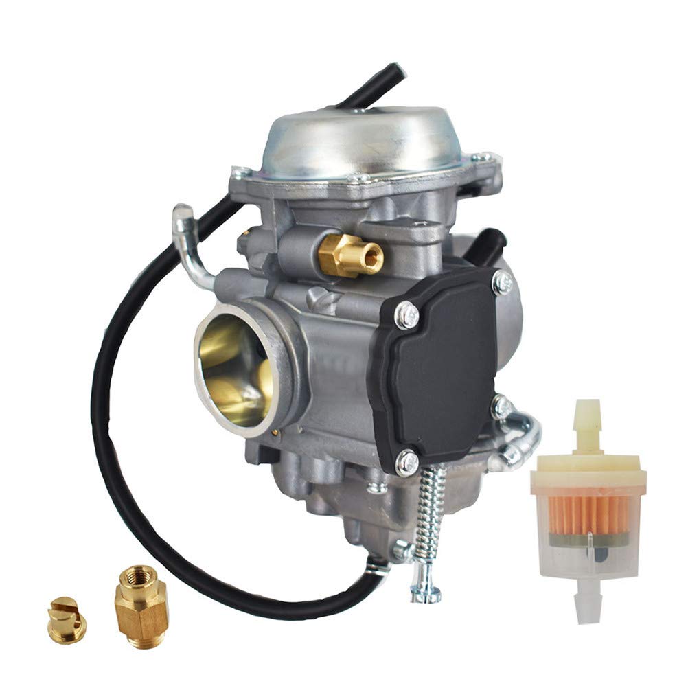 Q: What is included in the package when I purchase this carburetor?A: The package includes 1 x Carburetor, 1 x Throttle base cover, 1 x Throttle cable clip, 4 x Base cover screws, and 1 x inline fuel filter, providing all necessary components for replacement.