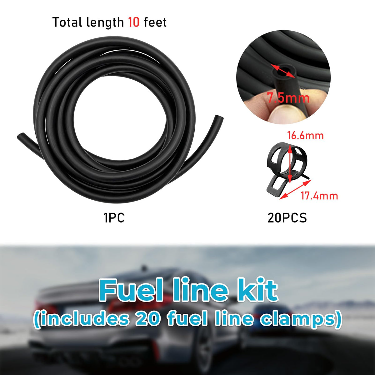 Augeny 10 Feet 1/4 Inch Id Fuel Line Hose With 20Pcs 2/5' Hose Clamps, Rubber Stretchy Fuel Line Kit For Motorcycle Small Disel Powersports Engines, Mowing Machine, Snow Machine (Black)