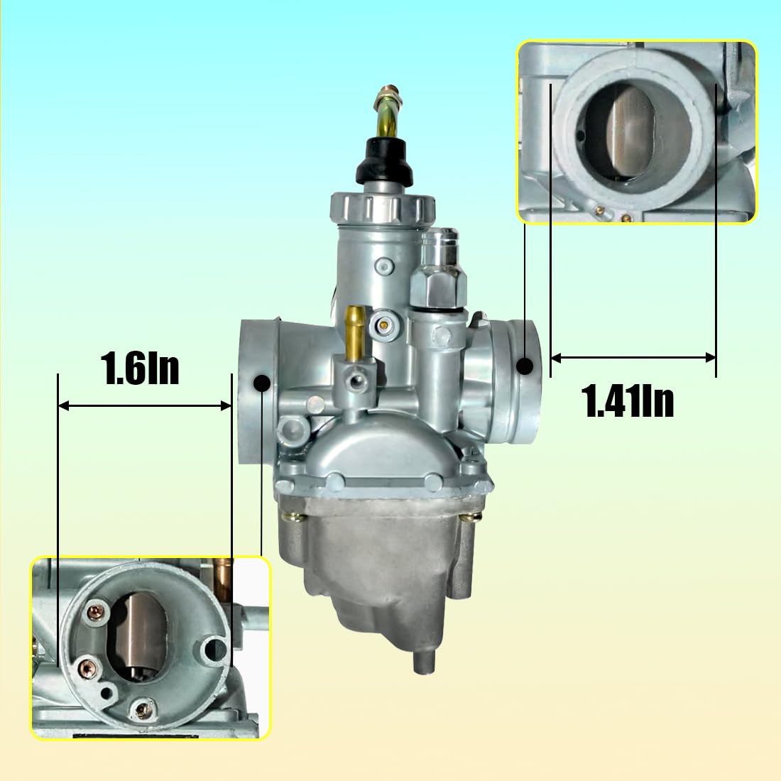 Q: What are the specifications of this carburetor?A: The specifications include an intake diameter of 25mm, an outer intake diameter of 36mm, and an outer diameter to the air filter of 40mm.