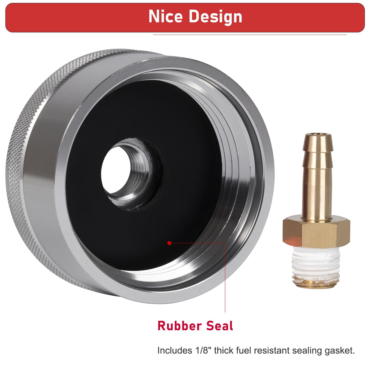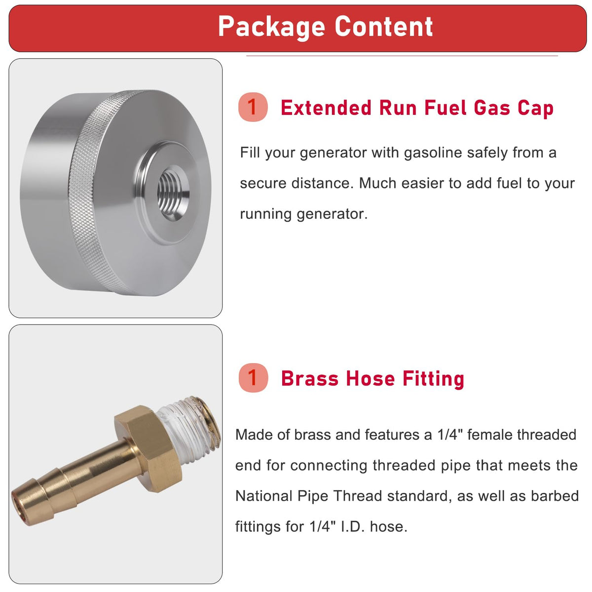 This custom fit for YAMAHA Generator gas cap adapter allows the user to hook up an auxiliary gas tank so that it can be used to feed the primary generator gas tank for extended operation time.Features:Safely add gasoline into your generator from a secure distance. Knurled for easy grip, locking and removing each unit is simplified. Use this gas cap to extend the range of your generator with a external tank. 1/4'' NPT female threads accept brass 90 degree street elbow or any fuel fitting that has a 1/4'' NPT male thread. Includes 1/8'' thick fuel resistant sealing gasket.Package Included: 1x Extended Run Fuel Gas Cap 1x Hose Fitting (As pictures shows)We committed to providing you a more wonderful service concept. Thanks for your click!Go Click the BUY NOW Button and Get This Awesome Extended Run Fuel Gas Cap now!
