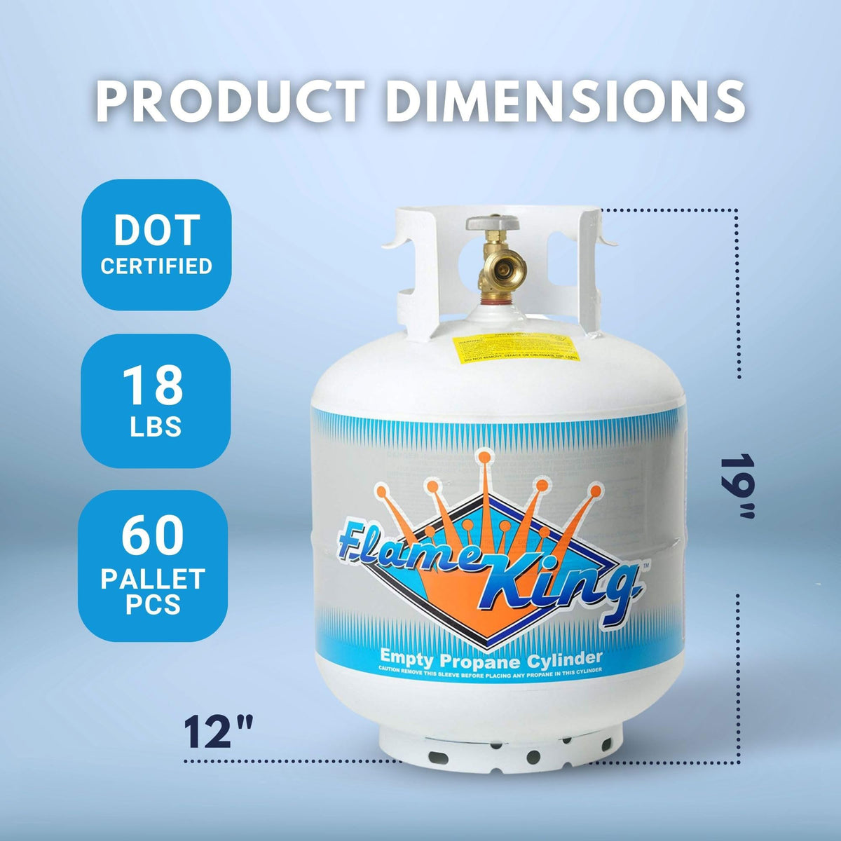 Q: What are the dimensions of the Flame King propane tank?A: The Flame King propane tank has a diameter of 12 inches and a length of 12.17 inches, making it compact and easy to store.