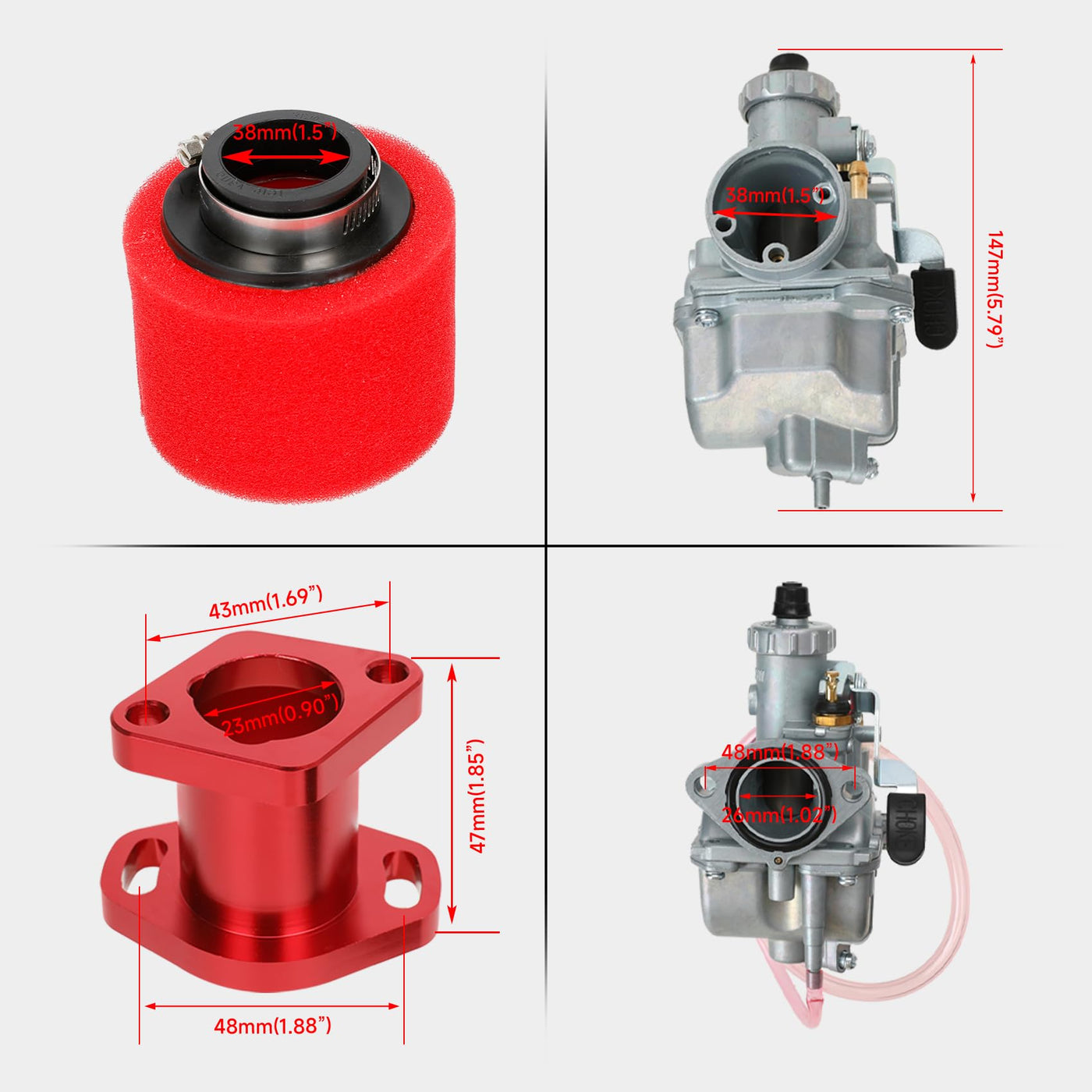 Package Include: 1 Pcs Carburetor 1 Pcs Red Air Filter 1 Pcs Fuel Filter 1 Pcs Wrench 1 Pcs Mainfold 1 Set Gaskets 1 Set Mounting Screws