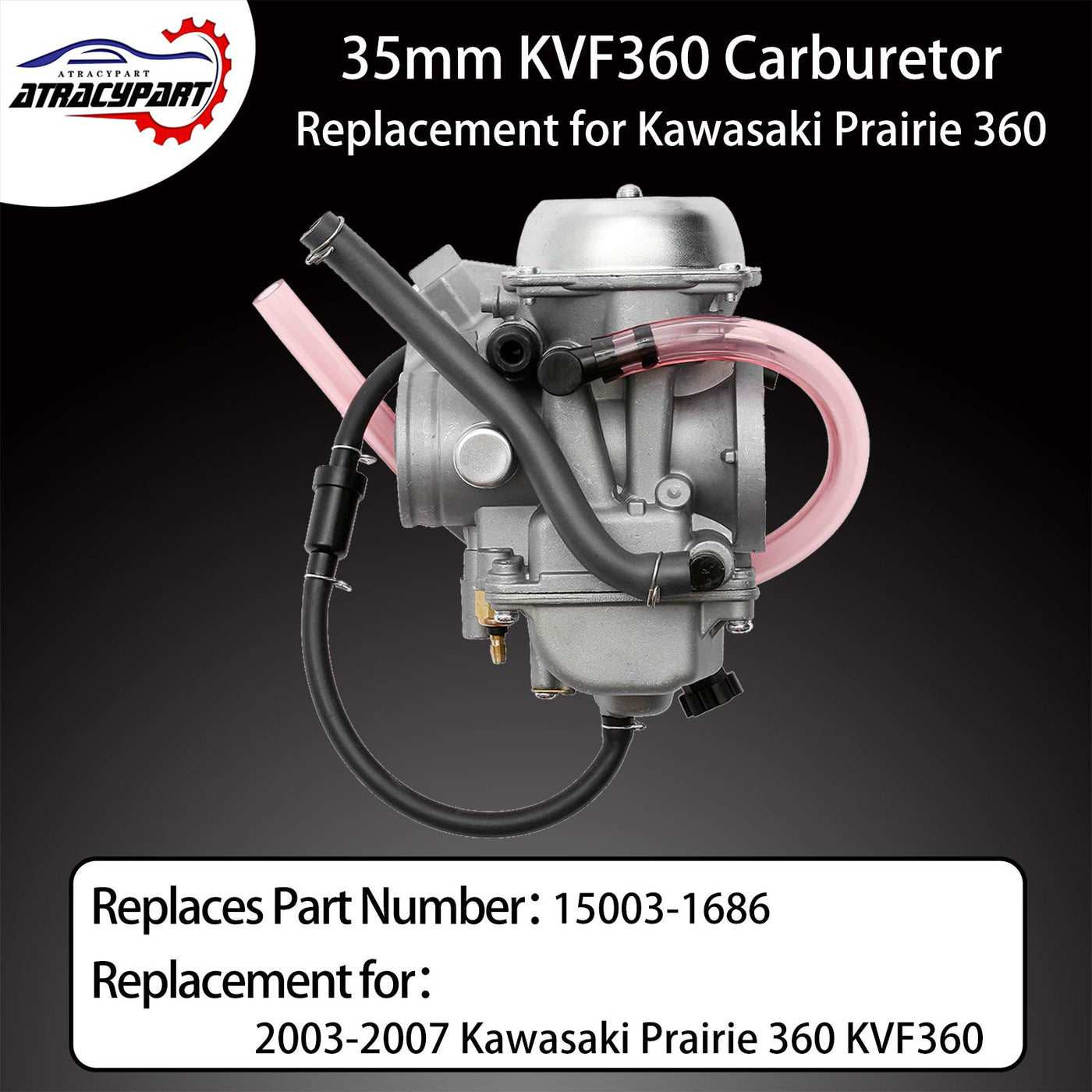 Q: Is the KVF360 carburetor compatible with all Kawasaki Prairie 360 models?A: The KVF360 carburetor is specifically designed for the 2003-2007 Kawasaki Prairie 360 models. Please ensure to check the compatibility by comparing the original part with the provided images, especially noting that there are 35mm and 32mm versions.