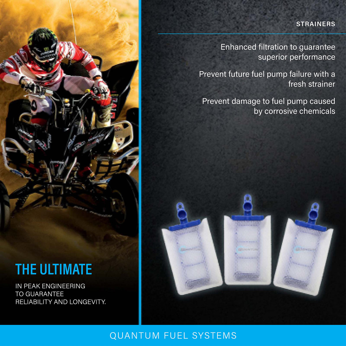 Q: What vehicles are compatible with the QFS Strainer Replacement Set?A: The QFS Strainer Replacement Set is designed for various Polaris models including the RZR 4, RZR 570, RZR 64 XP4 1000, and RZR 800, specifically those produced between 2011 and 2022. It is also compatible with other Polaris vehicles like Ranger 1000 XP and Ranger Crew models.