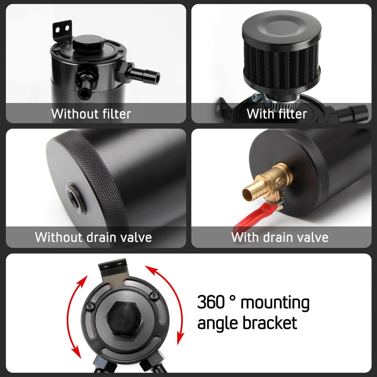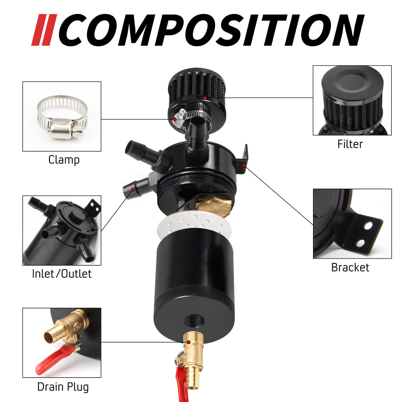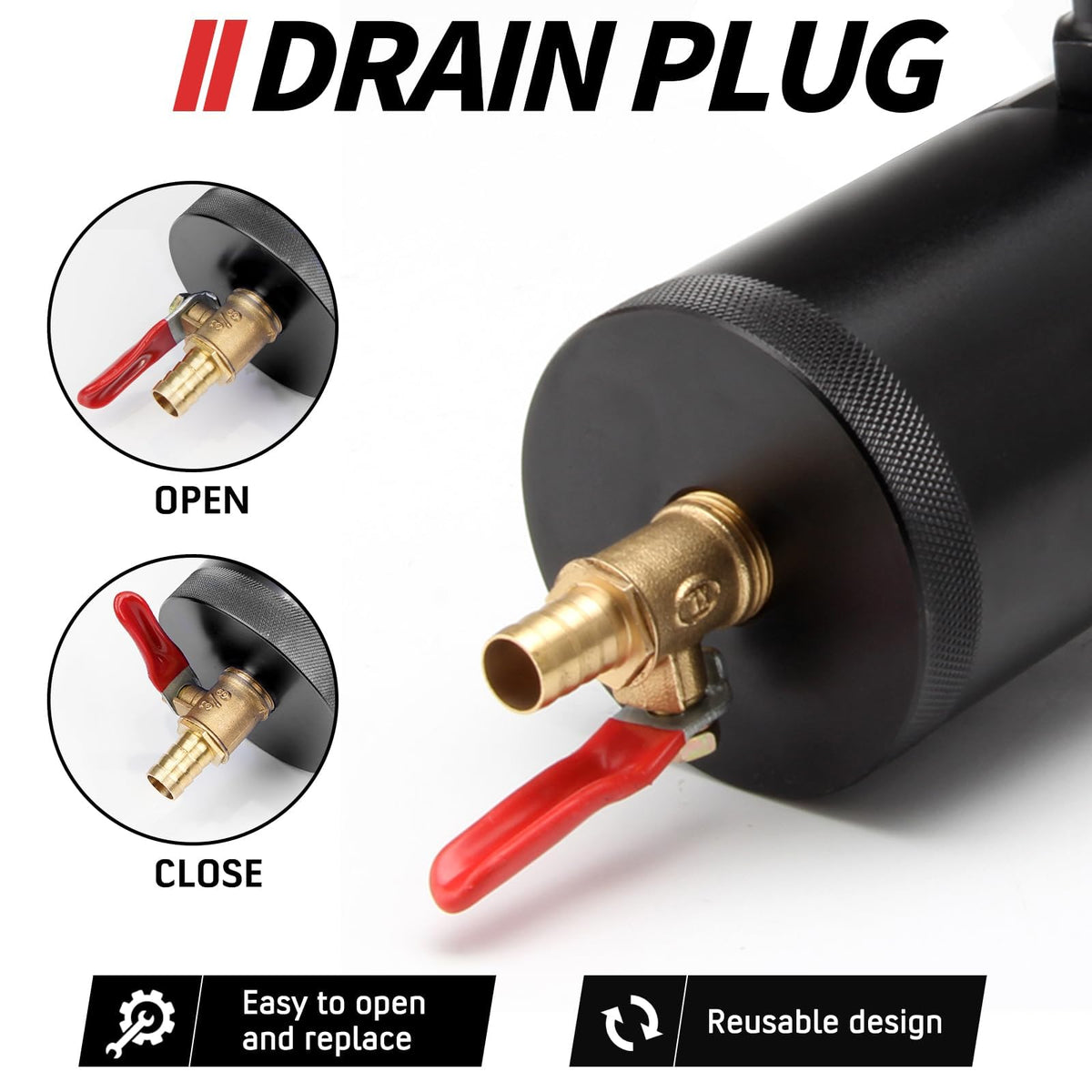 Reusable with Drain Valve: Equipped with a drain valve, the WENJTP Oil Catch Can allows for hassle-free emptying. When the can is full, simply unscrew the valve to discard the contents without needing to remove the unit—ensuring constant reuse.