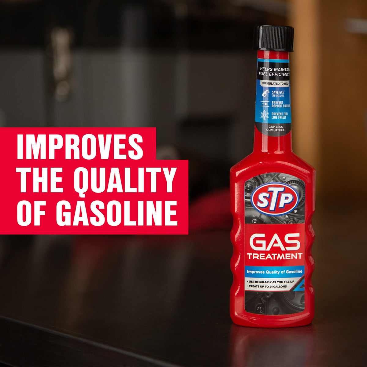 STP Gas Treatment improves the quality of gas by adding powerful cleaning agents that help fight the accumulation of harmful carbon, gum and varnish deposits in the fuel system that can reduce performance. Also engineered to remove water, which can lead to fuel line freeze. This product is made with jet fuel, a high-quality carrier of active ingredients.