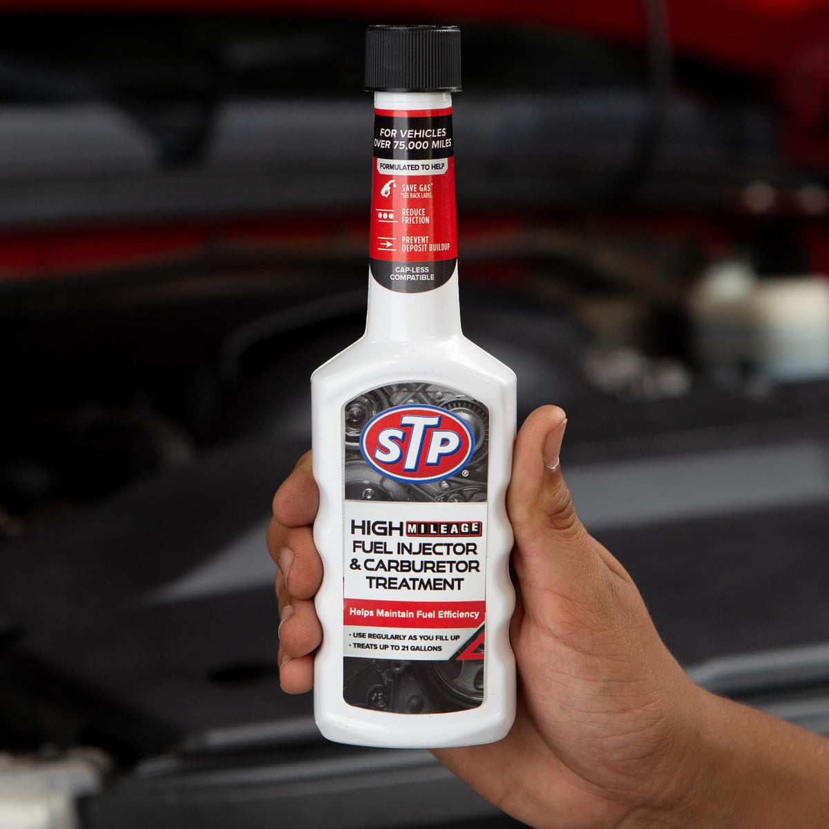 Keep the fuel injector and carburetor clean in your high-mileage vehicle with STP High Mileage Fuel Injector & Carburetor Cleaner Treatment. Formulated for vehicles with over 75,000 miles, this fuel injector cleaner features deposit-control additives to help remove deposits, which can help save gas. Friction modifier in this fuel injector treatment fights upper cylinder friction, maintaining engine efficiency. Just add this automotive lubricant and cleaner when you fill up your gas tank.