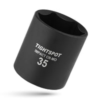 Q: What is the size and drive type of the TIGHTSPOT Shallow Impact Socket?A: The TIGHTSPOT Shallow Impact Socket has a 1/2-inch drive and a size of 35mm.