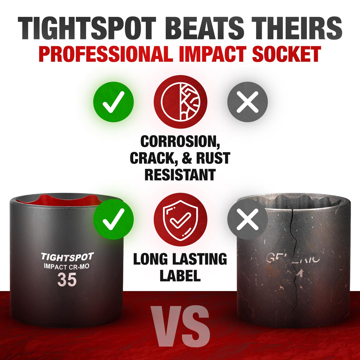 Q: What makes the TIGHTSPOT Shallow Impact Socket different from standard sockets?A: The TIGHTSPOT design allows for better accessibility in tight spaces, while its shallow depth provides enhanced torque capabilities compared to standard sockets.