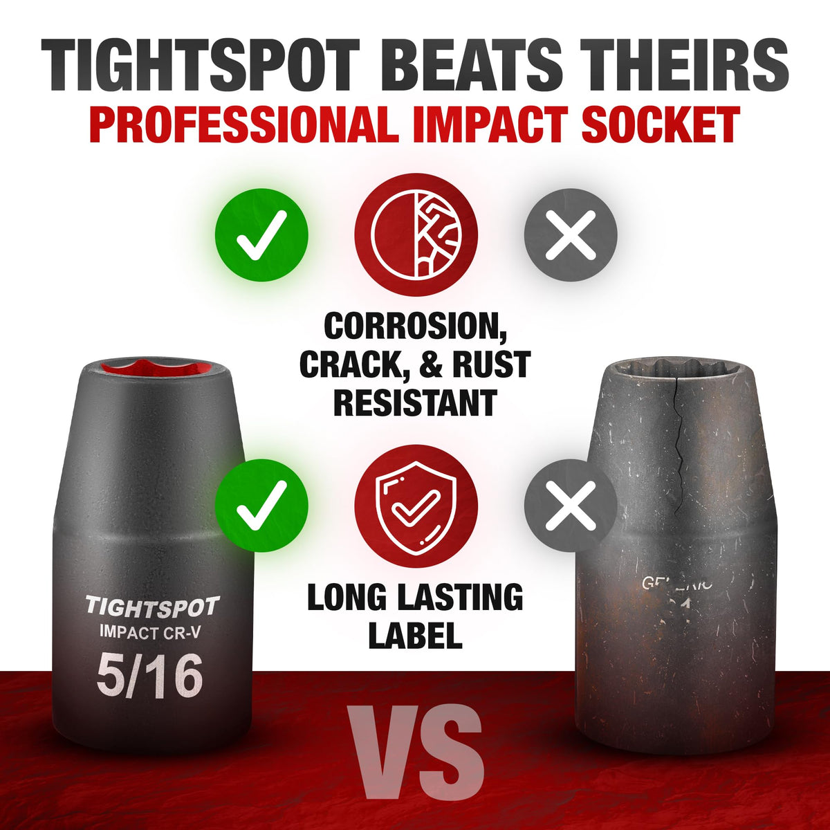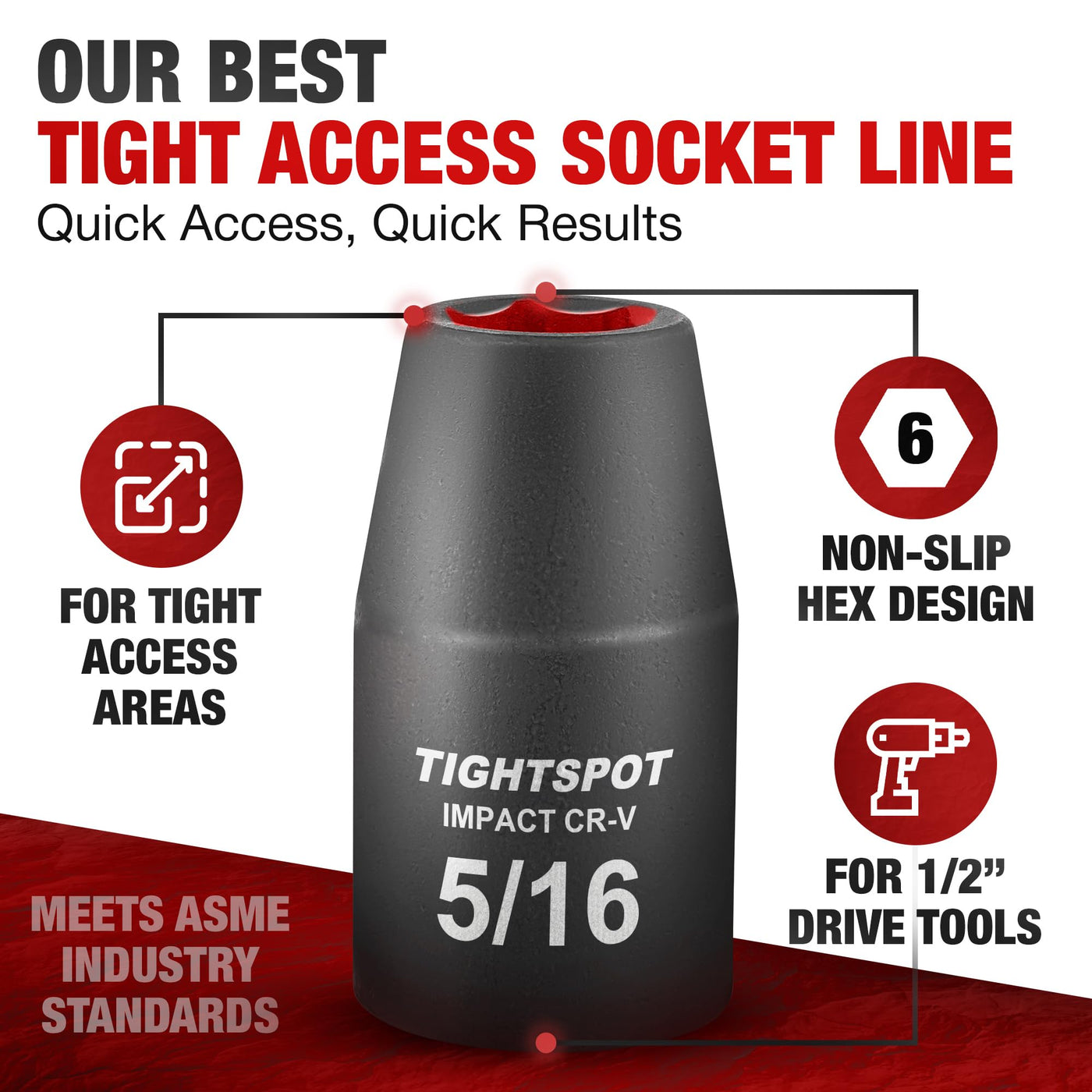 Q: Is the 1/2" Dr 5/16” TIGHTSPOT Shallow Impact Socket suitable for tight spaces?A: Yes, the TIGHTSPOT design of this shallow impact socket allows for use in tight spaces, making it ideal for various automotive and mechanical applications.