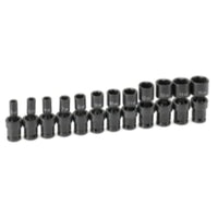 GP9712UM Features: -Made of high quality steel (chrome-molybdenum); thorough and exact heat treatment insures the correct balance of strength and durability.-Made to transfer the pressure from the thinnest part of the socket wall toward the thicker section, resulting in increased strength.-Allows up to 20% more torque to be applied than on standard hex impact sockets. Construction: -Engineered specifically for use with impact tools, using the most up to date industrial specifications. Dimensions: -12 Piece 1/4'' Drive 6 Point Metric Universal Impact Socket Set. Warranty: -Lifetime warrantyThis metric universal impact socket set features our high torque drive. This feature limits the amount of wear on the corners of the fastener and the socket. It also improves the strength of the socket, transfers increased torque to the fastener and allows easier access to tight areas. Each socket is thoroughly made with the correct balance of strength and durability and is tested to the highest specifications to deliver outstanding performance at the most competitive cost. Set contains the following sizes: 5mm, 5.5mm, 6mm, 7mm, 8mm, 9mm, 10mm, 11mm, 12mm, 13mm, 14mm and 15mm. Packaged in a plastic storage tray..-Sets & Kits do not have warranty/ see individual pcs for details.