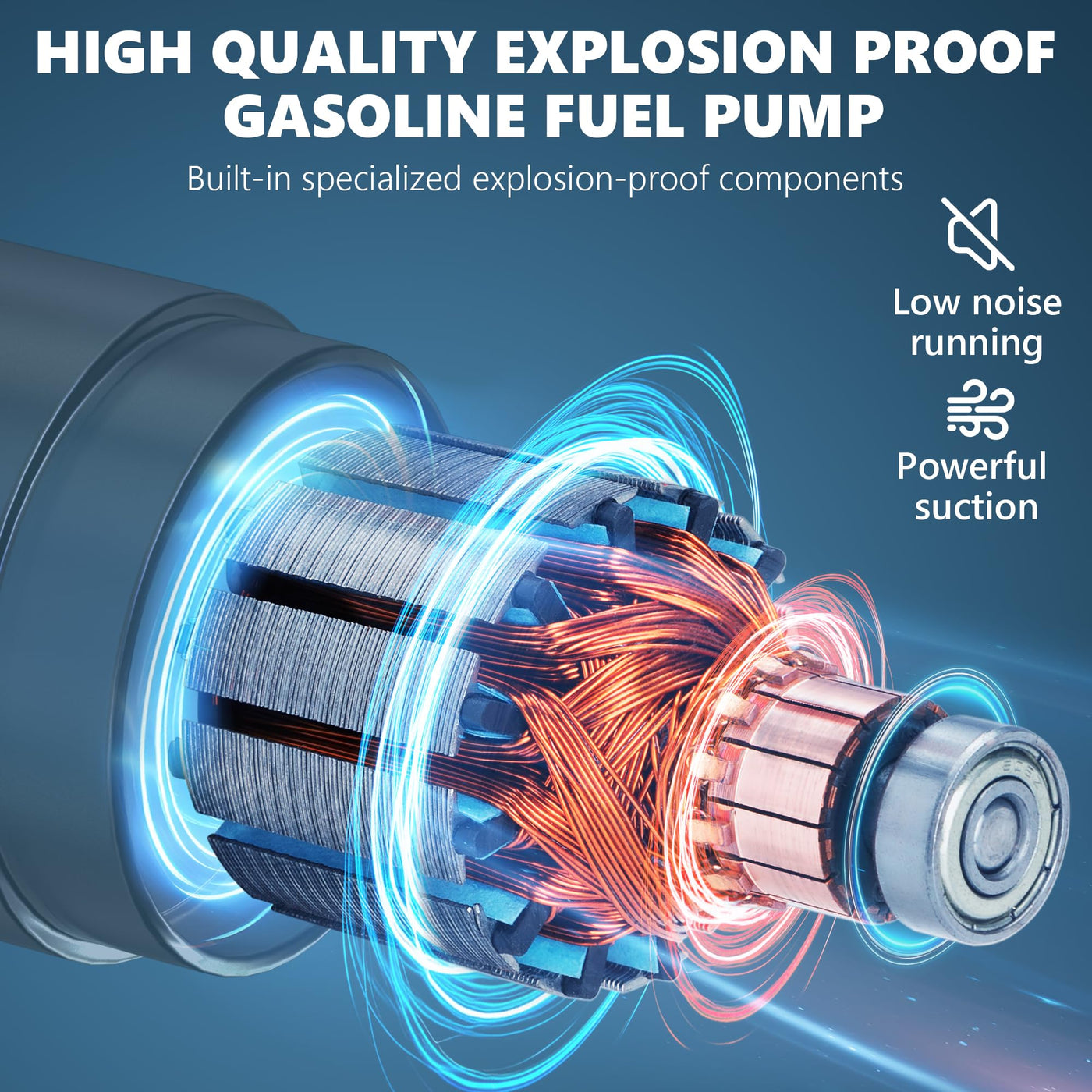 Q: Is there any safety feature in the gasoline fuel pump?A: Yes, the pump features overheat protection and is designed with safety components to operate without sparks. It also comes with a fuel inlet hose with a filter and a fuel outlet hose to enhance safety during use.