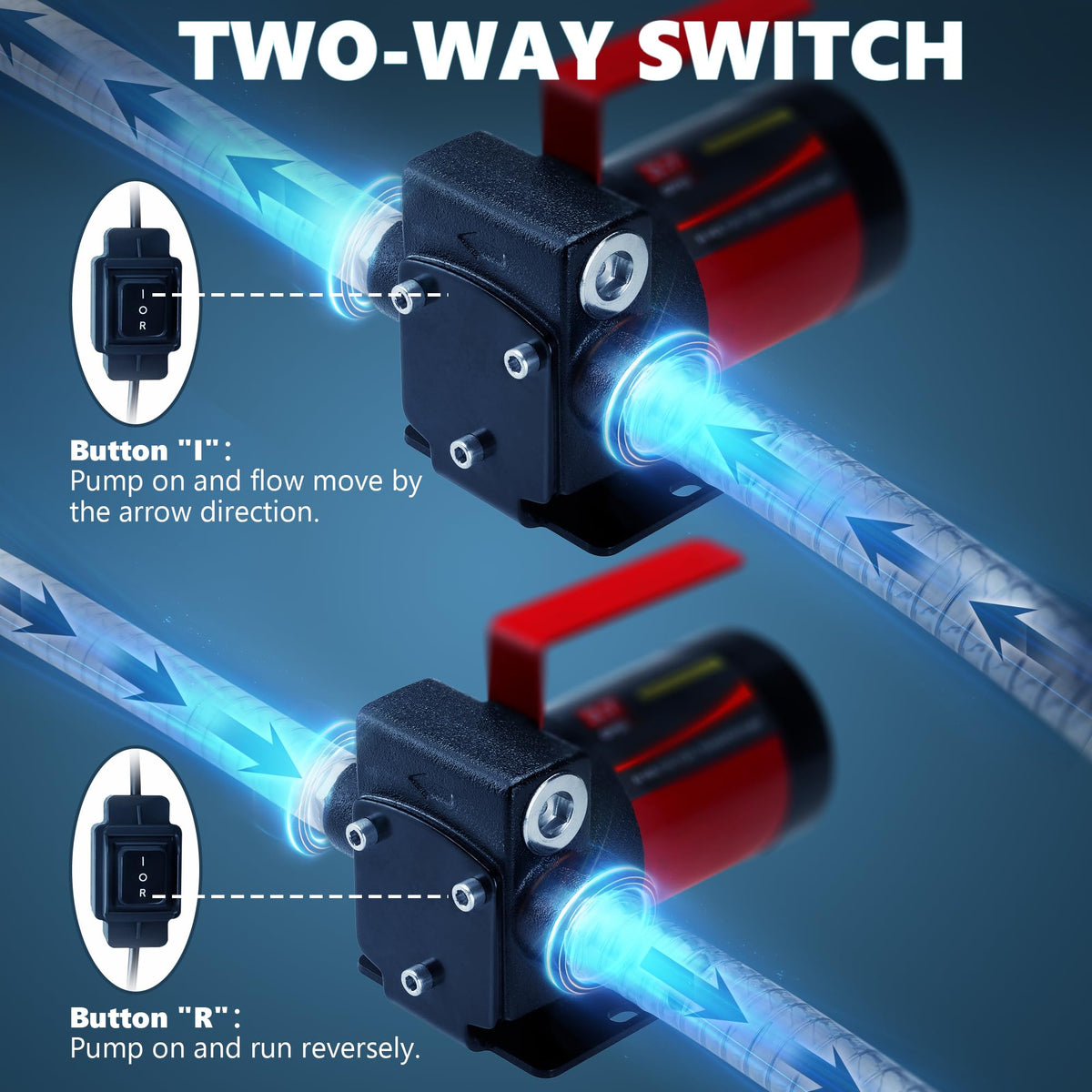 Q: How does the two-way switch work on this fuel transfer pump?A: The two-way switch on the 110V AC Gasoline Fuel Pump allows you to change the pumping direction. By toggling the on/off button, you can easily switch between filling and emptying modes to meet your specific needs.