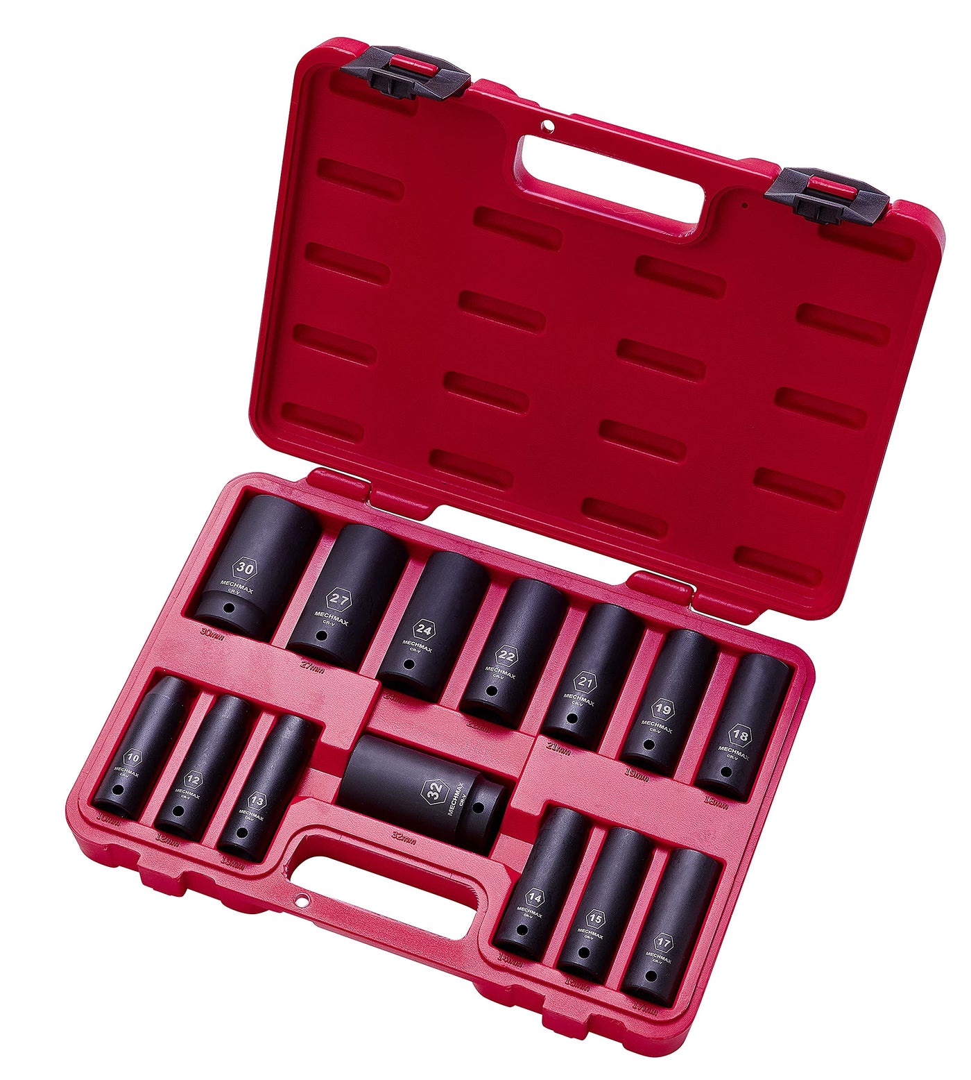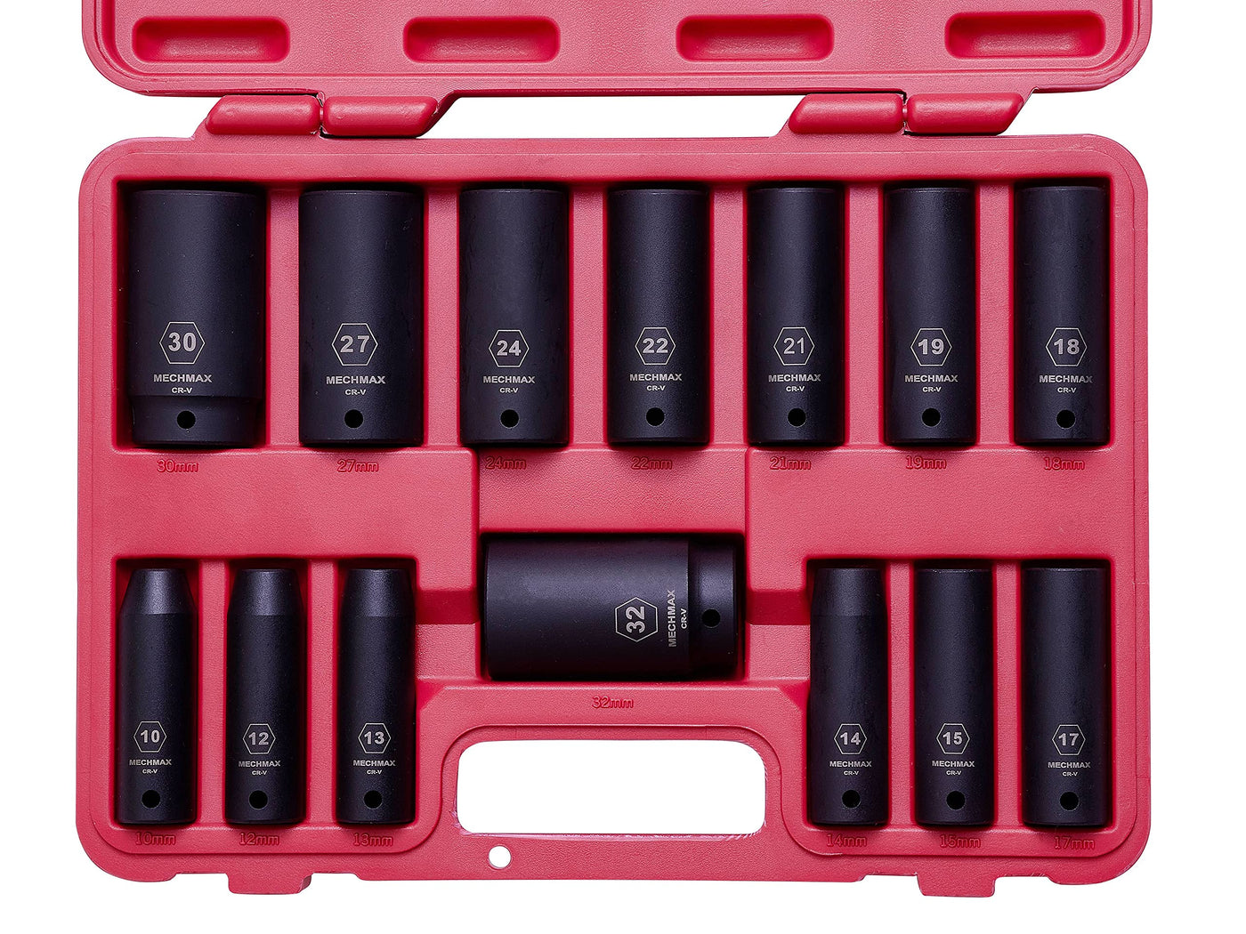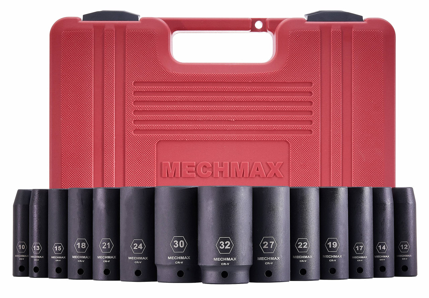 14 Piece Mechmax Heavy Duty Thick Wall Impact Deep Socket Set 1/2 Inch Drive Metric Sizes, 10-32 Mm Chrome Vanadium Steel Mechanic Tool Kit With Box Storage Case