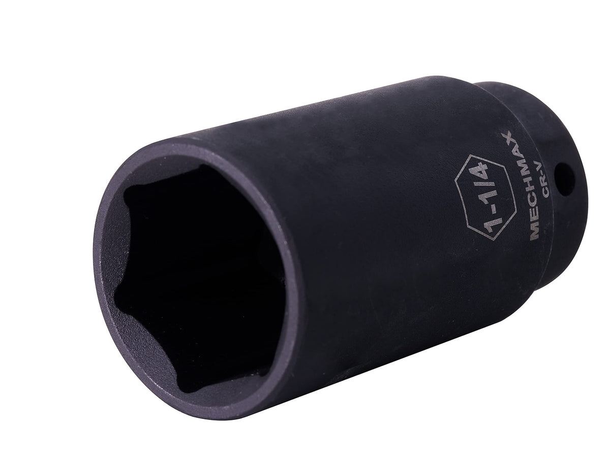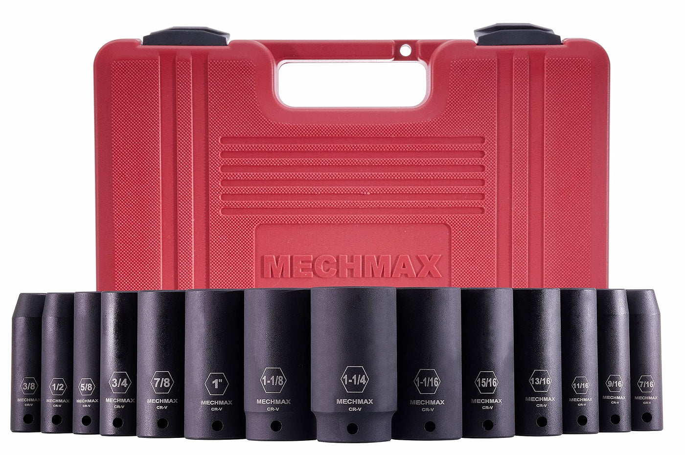 The MECHMAX 14 Piece 1/2 in Drive Deep Impact Socket Set is ideal for professional heavy duty mechanic projects, include large sizes 1-1/16, 1-1/8 and 1-1/4 inch. The MECHMAX 14 Piece 1/2 in Drive Deep Impact Socket set made from drop forge chrome vanadium steel with heat treated and black phosphate coating, provide torque, strength, durability and corrosion resistance, meets or exceeds ASME specifications. The MECHMAX 14 Piece 1/2 in Drive Deep Impact Socket Set comes with high visibility laser etched markings for easy reading and quick socket selection, sockets organized in a heavy duty blow mold case for easy storage and portability. SET INCLUDES: 14- 1/2 in Drive Deep Impact Sockets: 3/8, 7/16, 1/2, 9/16, 5/8, 11/16, 3/4, 13/16, 7/8, 15/16, 1, 1-1/16, 1-1/8, 1-1/4 inch