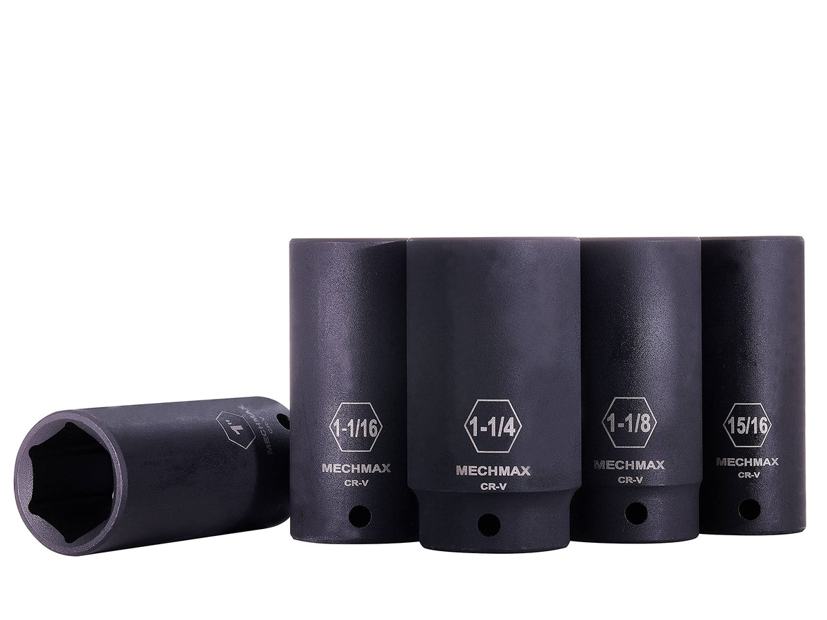 Q: What sizes are included in the MECHMAX 14 Piece Deep Socket Set?A: The MECHMAX 14 Piece Deep Socket Set includes sizes ranging from 3/8 inch to 1-1/4 inch, covering a variety of needs for both professional and home mechanic projects.