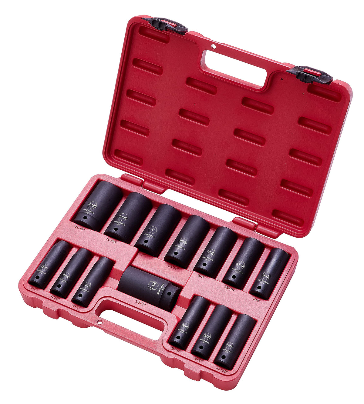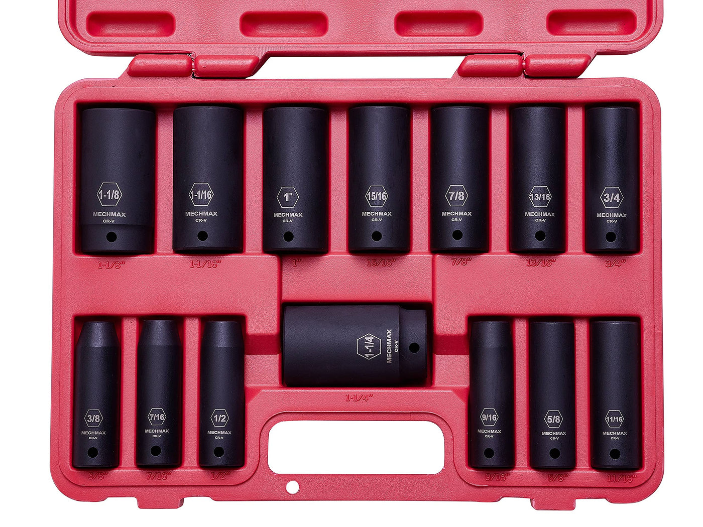 14 Piece Mechmax Heavy Duty Thick Wall Impact Deep Socket Set 1/2 Inch Drive Standard Sizes, 3/8-1-1/4 Inch Chrome Vanadium Steel Mechanic Tool Kit With Box Storage Case