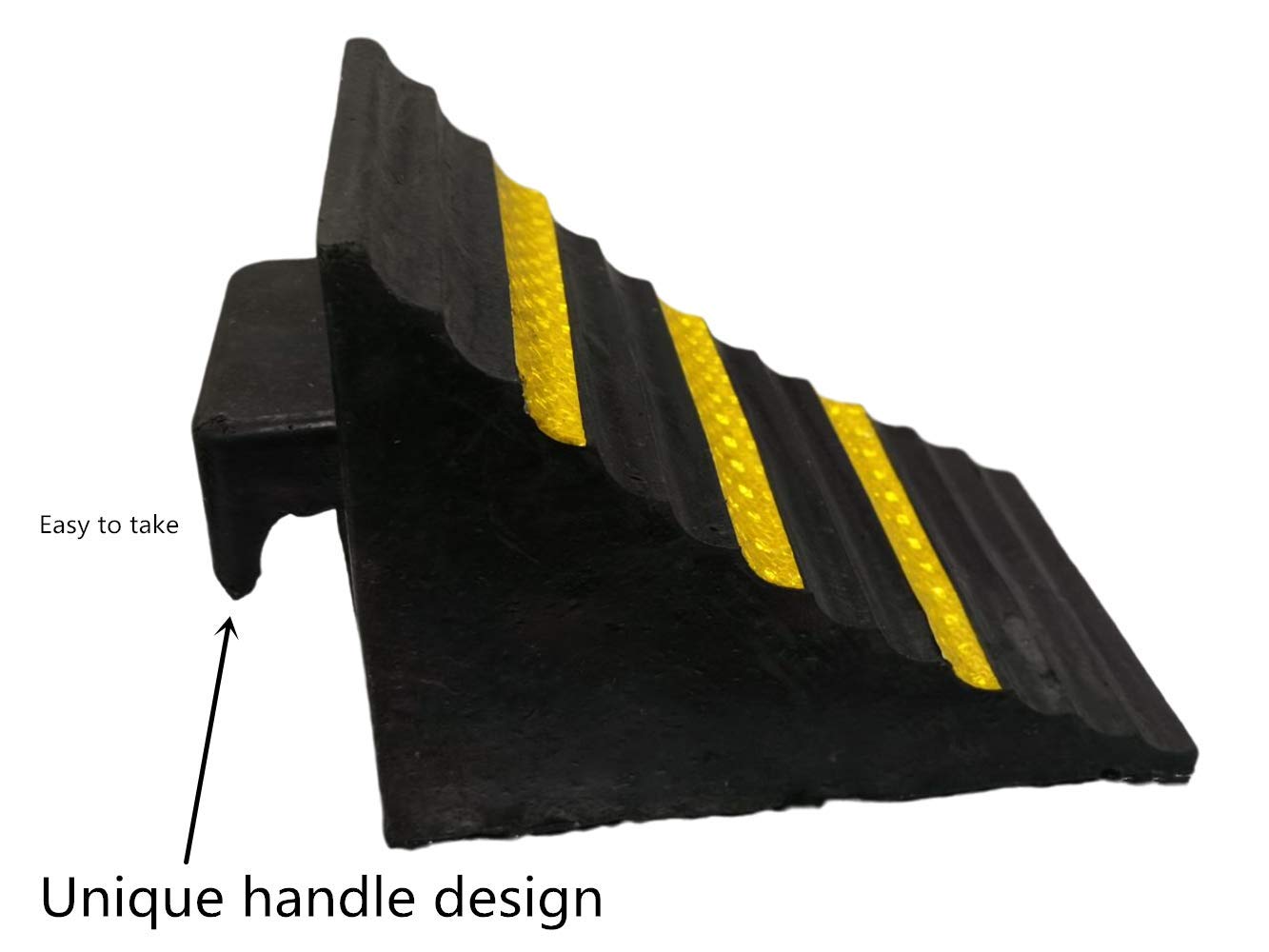 Q: How do the reflective tapes enhance safety?A: The bright reflective stripes on the sides of the wheel chocks provide high visibility, ensuring they can be seen from any angle, day or night. This feature is especially beneficial in low-light conditions, helping to prevent accidents and improve safety for pedestrians.