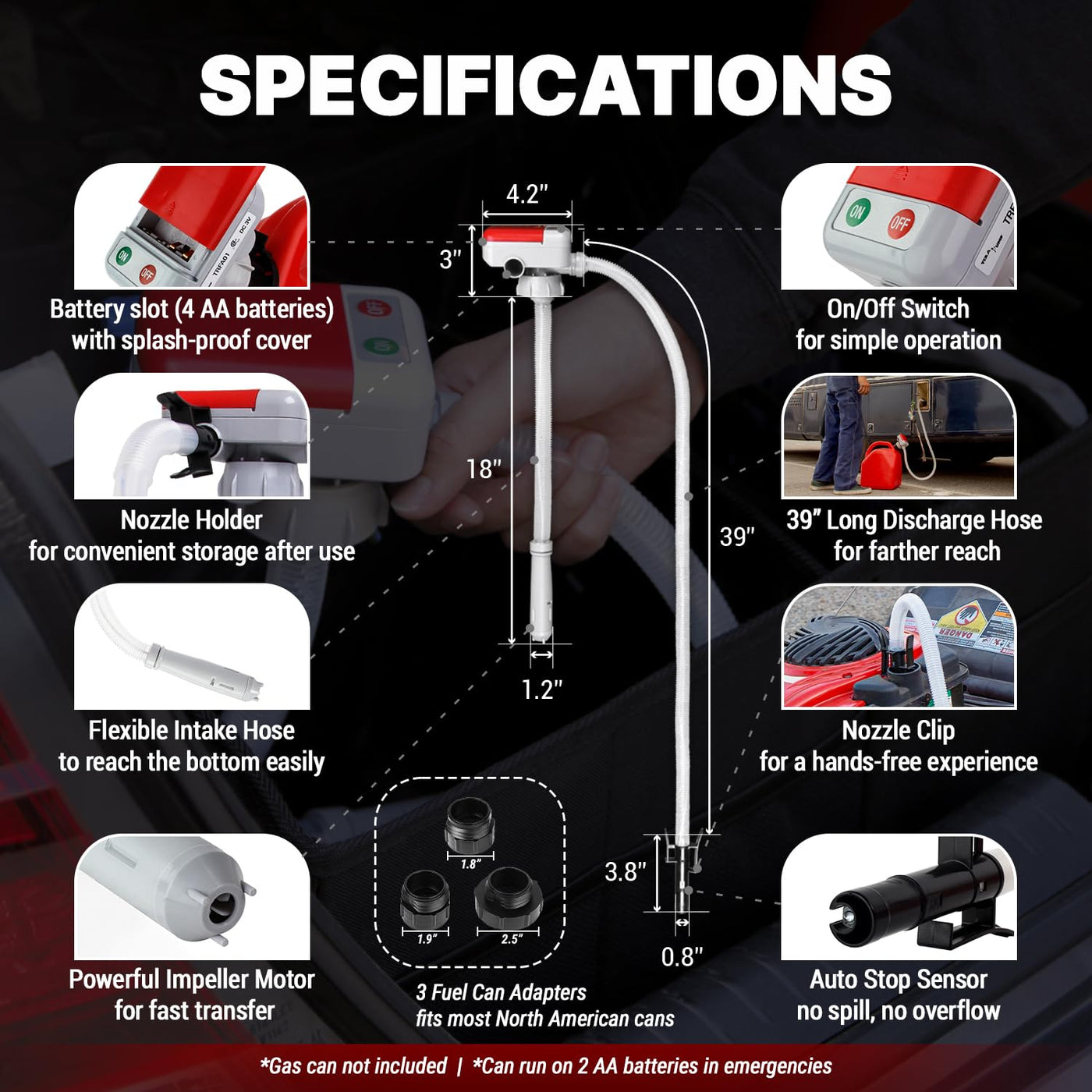 Q: What is included with the TERA PUMP purchase?A: The TERA PUMP 4th Gen TRFA01 comes with three gas can adapters suitable for 3 to 5-gallon sized cans, a long hose for easy maneuverability, and it is powered by 4 AA batteries (not included), making it versatile for various fuel containers.