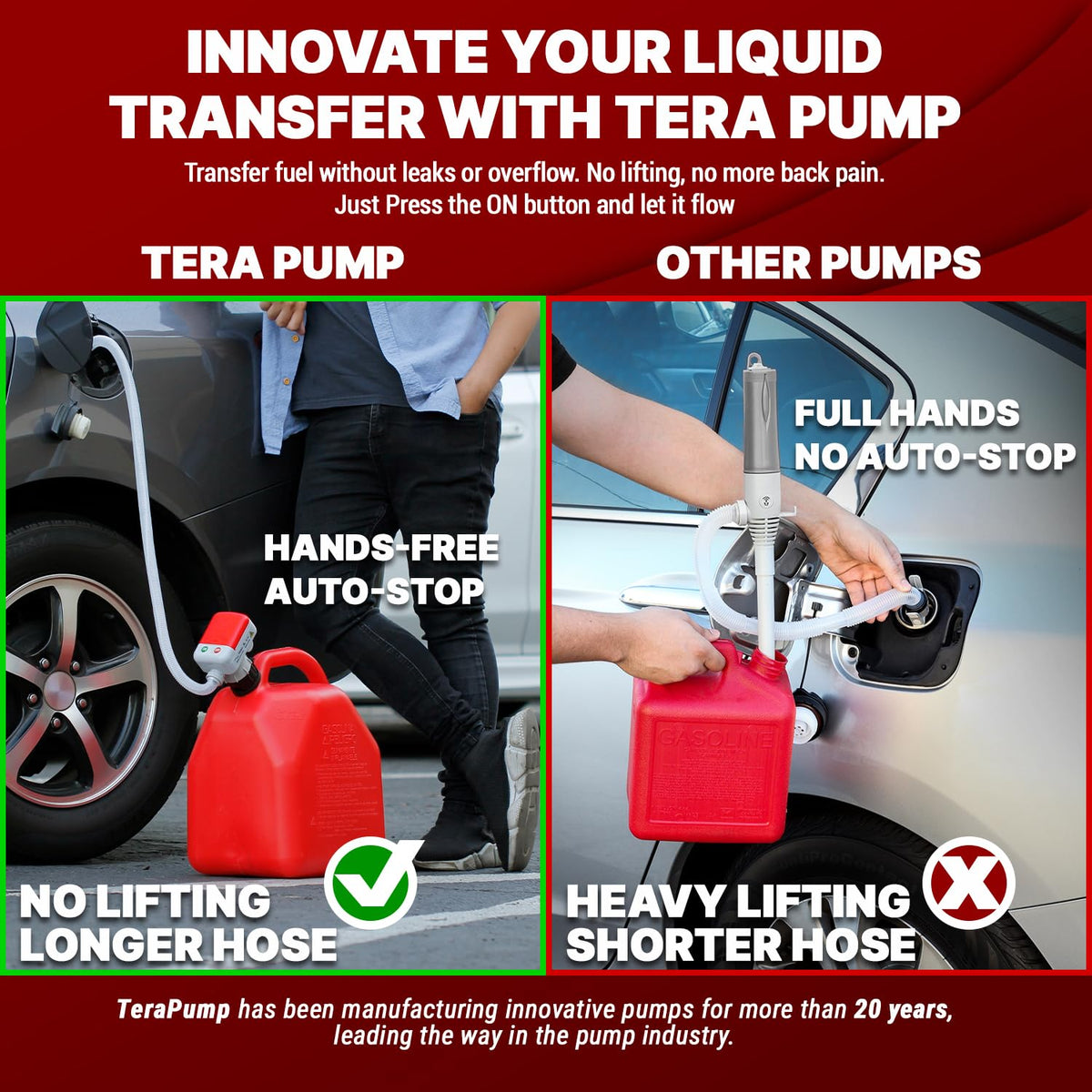 Q: Is the TERA PUMP easy to use for refueling vehicles?A: Yes, the TERA PUMP simplifies refueling by featuring a 39-inch outtake hose that allows you to reach most gas cans and tanks without lifting them. Just press the ON button, and the pump will automatically transfer fuel to your vehicle or equipment.