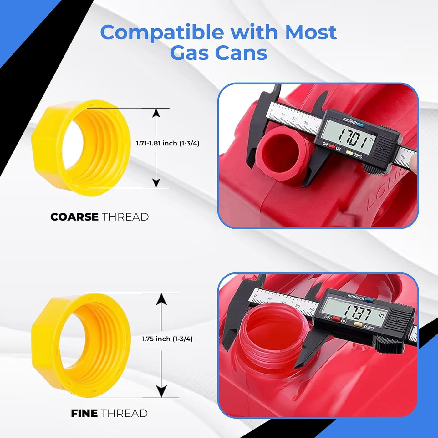 Q: Is the gas can spout compatible with all types of gas cans?A: Yes, our gas can spout replacement kit is designed to be compatible with most oil cans and comes with two distinct size base caps to maximize compatibility with various gas can openings.