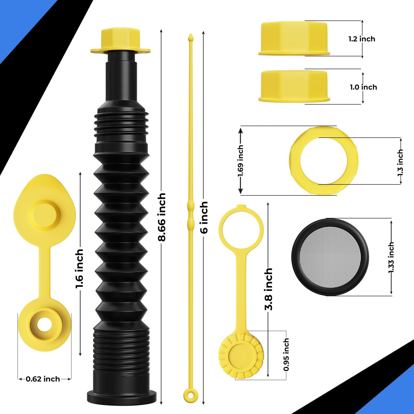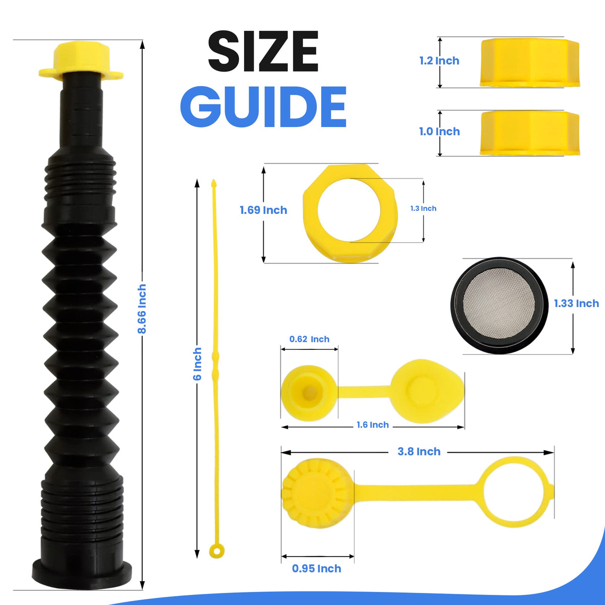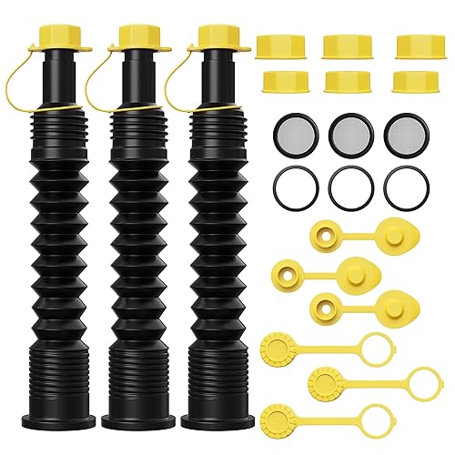 Q: What is included in the 3-kit Universal Gas Can Spout Replacement?A: The kit includes 3 flexible spouts, 6 base caps, 6 gas can vent caps, 3 rubber gaskets, 2 distinct spout caps, 3 filter screens, and 3 lanyards, providing everything you need for safe and efficient fuel transfer.