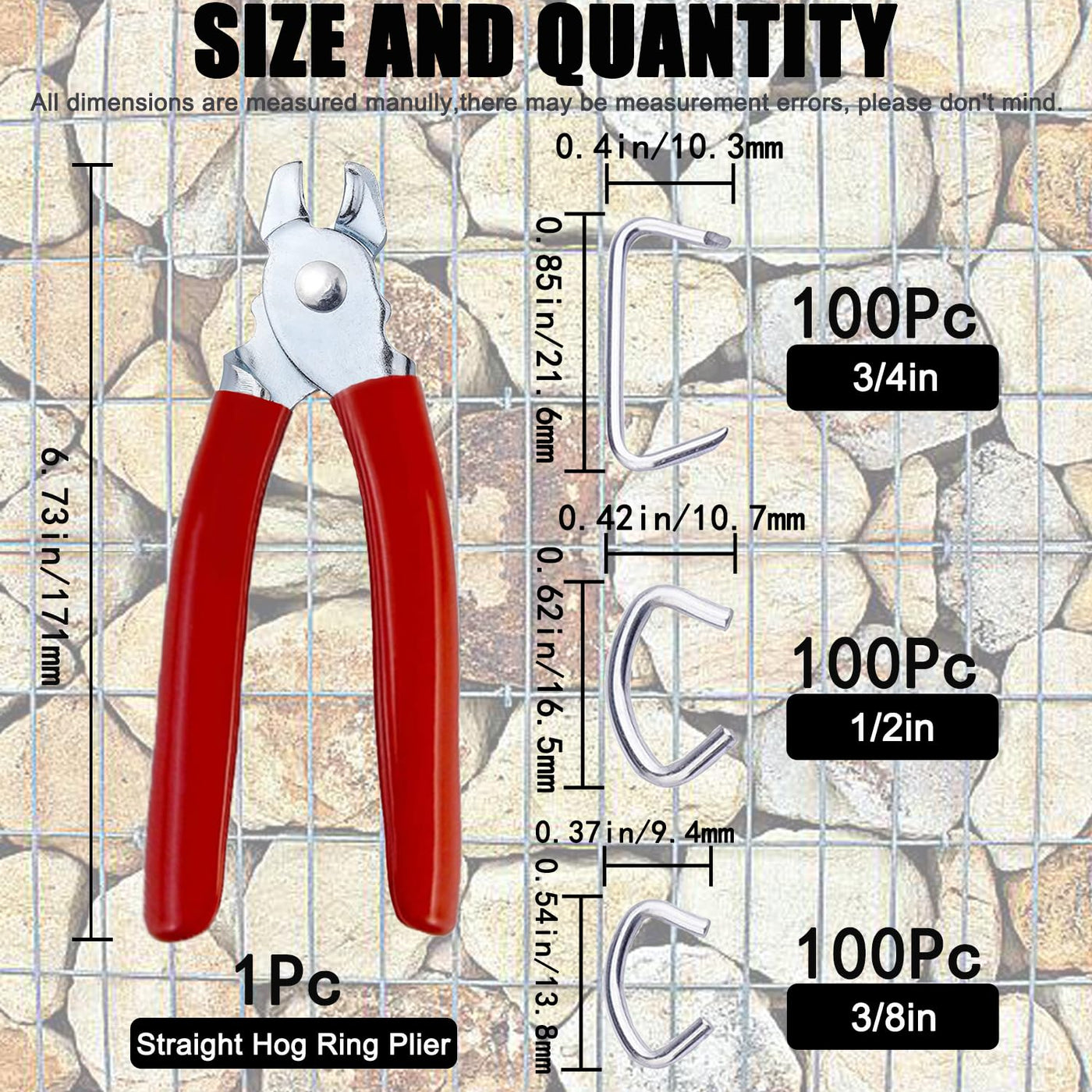 ?Hog Ring Kit Includes?This set contains 1 straight hog ring plier, 100 pcs of 3/4' hog rings, 100 pcs of 1/2' hog rings, and 100 pcs of 3/8' hog rings, providing a comprehensive solution for various tasks.