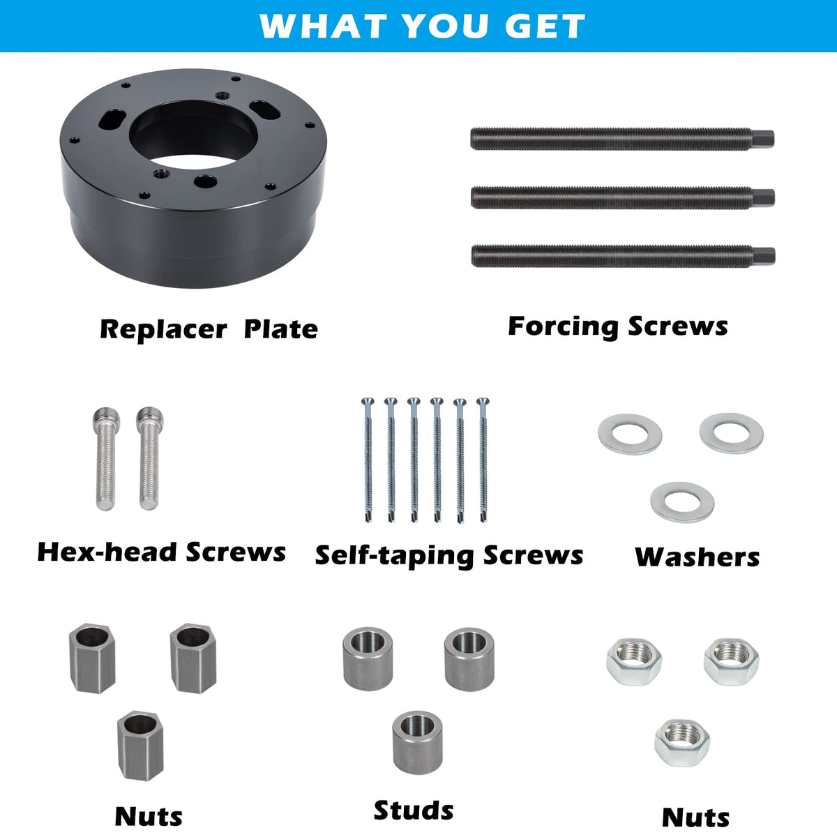 Q: What is included in the package when I purchase this tool?A: The package includes 1 Sleeve Remover, 3 Washers, 3 Short Nuts, 3 Long Nuts, 3 Studs, 3 Forcing Screws, 2 Hex-head Screws, and 6 Self-tapping Screws.