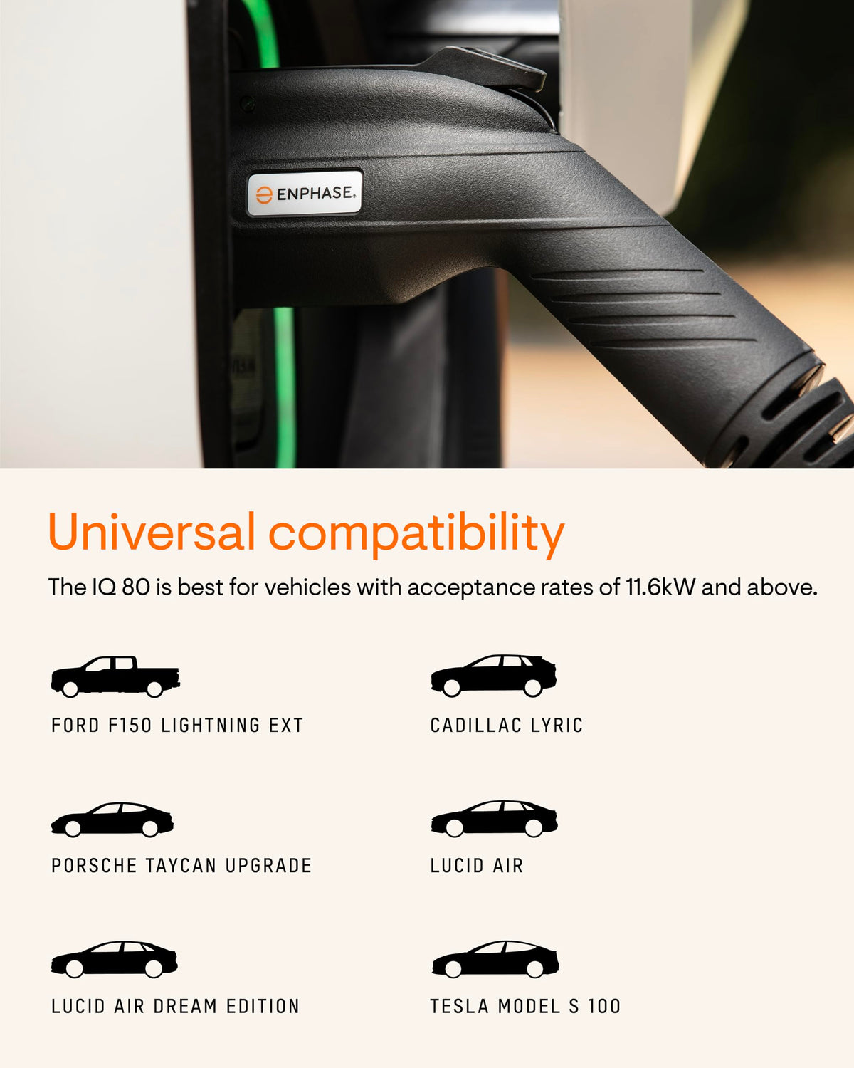 Experience smart charging with the IQ 80 EV Charger, a reliable Level 2 station with energy management and custom scheduling via the Enphase App. Harness excess solar power for EV charging when integrated with the Enphase Energy System. Designed for all-weather use with a NEMA 4-rated enclosure, it offers flexible reach with a 25ft cable. Compatible with all EVs, it features a durable, impact-resistant J1772 connector. Enjoy peace of mind with a 5-year limited warranty. Please note: If integrated with the Enphase Energy System, the IQ 80 requires a minimum of 3.84 kW (16 Amps) of excess solar power to start a charging session. Production and Consumption CTs are required to calculate the excess solar power. EVSE power levels will increase and decrease in 25% intervals only. For additional information, please contact your installer.