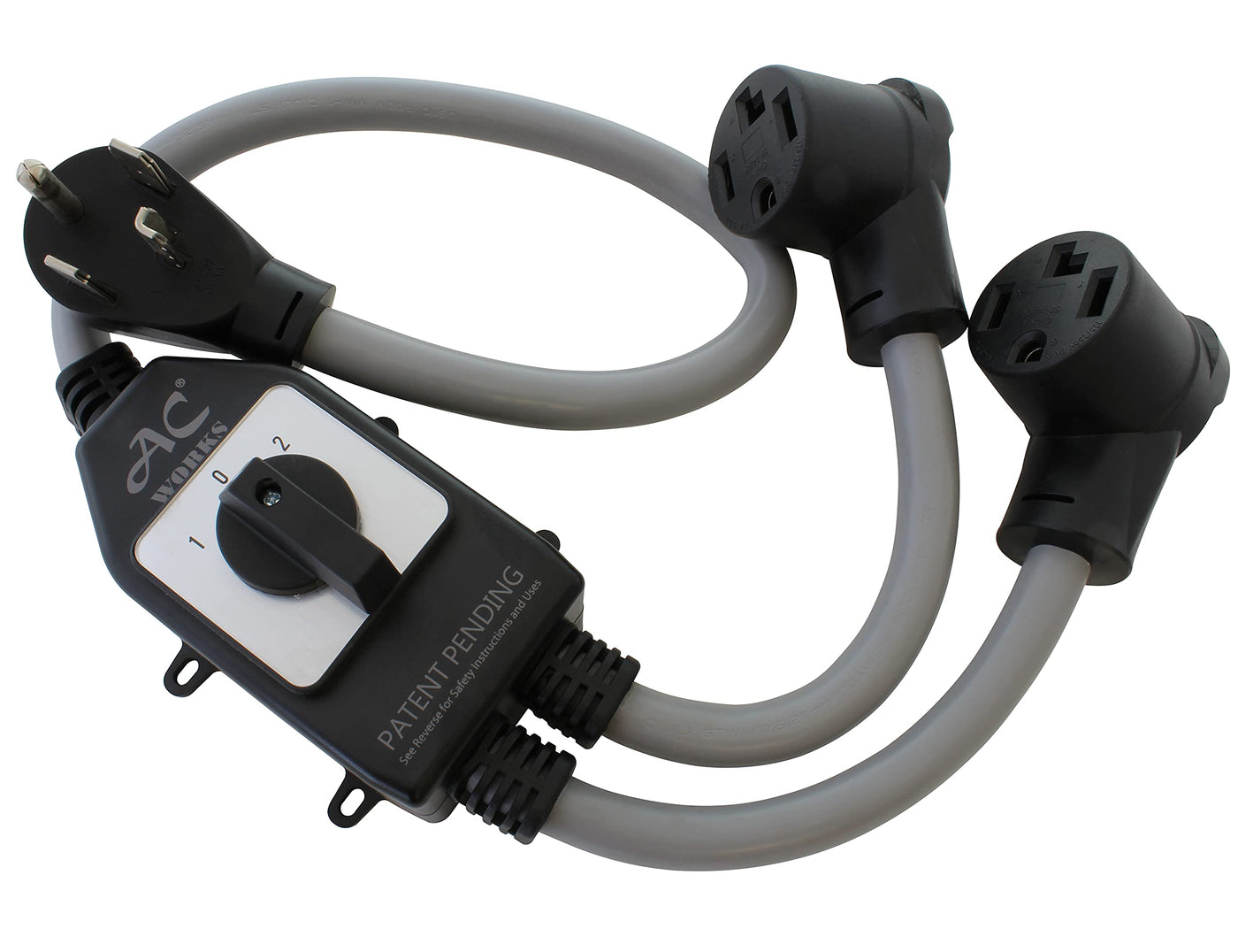 This Ac Works Brand Safety Switch Y-Cable Evy1430Sw-036] Is Very Durable With A Length Of 3 Feet It Is A Nema 14-30P To Two Nema 14-30R The Adapter Is Used To Connect Two Different Appliances, Like A Dryer And Your Ev Charging Cable, At Once Without Having To Plug And Unplug Cords All The Time, Running The Risk For Arching And Fire Hazards Using This Switch, You Can Plug Two Appliances In At Once And Power One Appliance At A Time, Without Tripping The Breaker A Common Use For This Product Is Switching Between Powering Your 4-Prong Dryer And Ev Charger Keep Both Items Plugged In, One To Each Of The Connectors, And Then Use The Switch To Power Each One At Different Times You Can Even Label The Switches For More Convenience This Product Includes A 5-Year Limited Warranty Stw 104, 600 Volt Jacket With A 30 Amp Copper Wire Nema 14-30P To Two Nema 14-30R Nema 14-30P, 30 Amp, 125250 Volt, 4-Prong Male Plug Two Nema 14-30R, 30 Amp, 125250 Volt, 4-Prong Connectors Flexible And Weather Resistant Jacket Cable Conveniently Switch From Powering Your Dryer To Charging Electrical Vehicle Mounting Holes