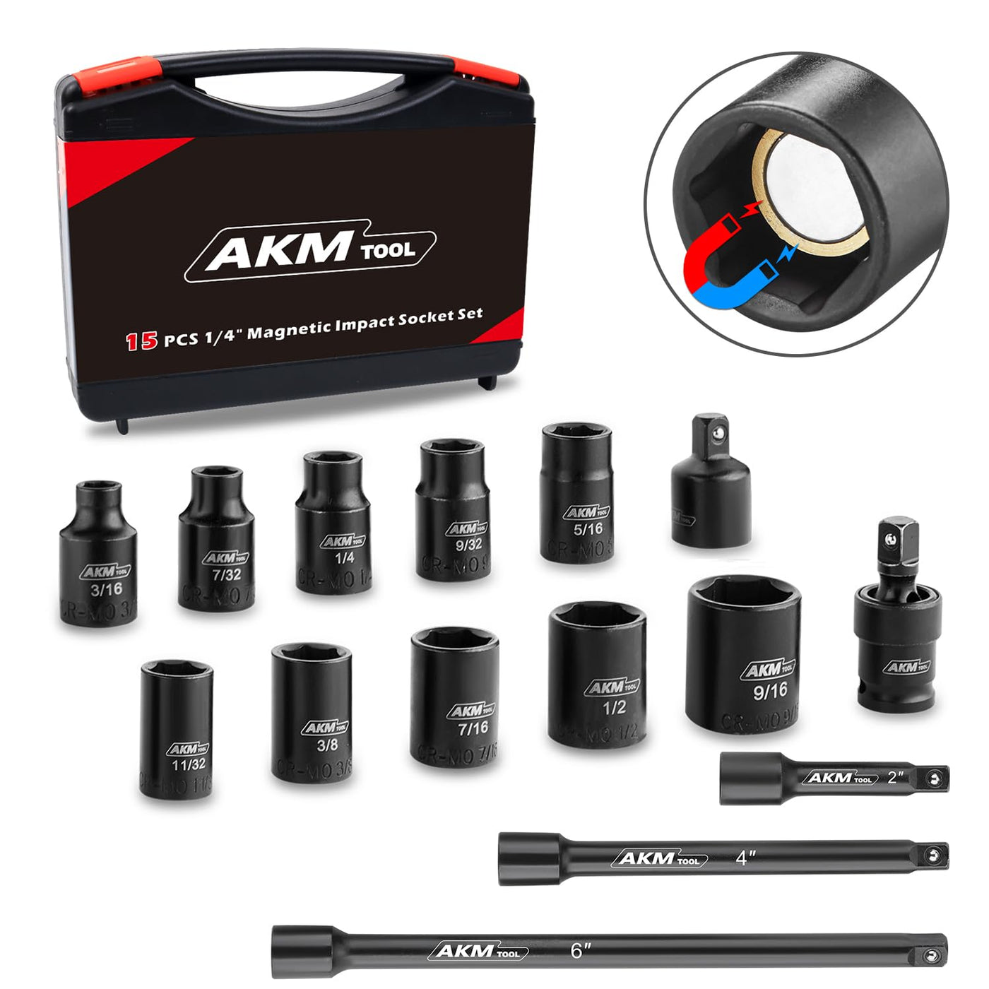 Akm Tool 1/4 Inch Drive Magnetic Impact Socket Set, 15-Piece Sae, 1/4 Inch-9/16 Inch, 6 Point, Cr-Mo, Square Drive, Magnetic Socket With Impact Socket Adapter, Universal Joint & Extension