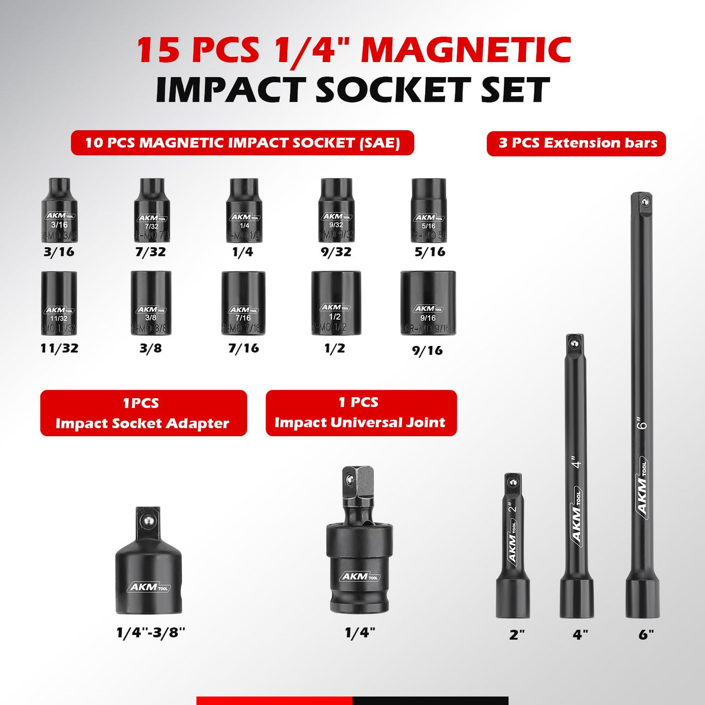Q: What sizes are included in the AKM TOOL 1/4 Inch Drive Magnetic Impact Socket Set?A: The AKM TOOL set includes 10 pieces of 1/4" SAE Magnetic Impact Sockets in sizes: 1/4, 3/16, 7/32, 9/32, 5/16, 11/32, 3/8, 7/16, 1/2, and 9/16.