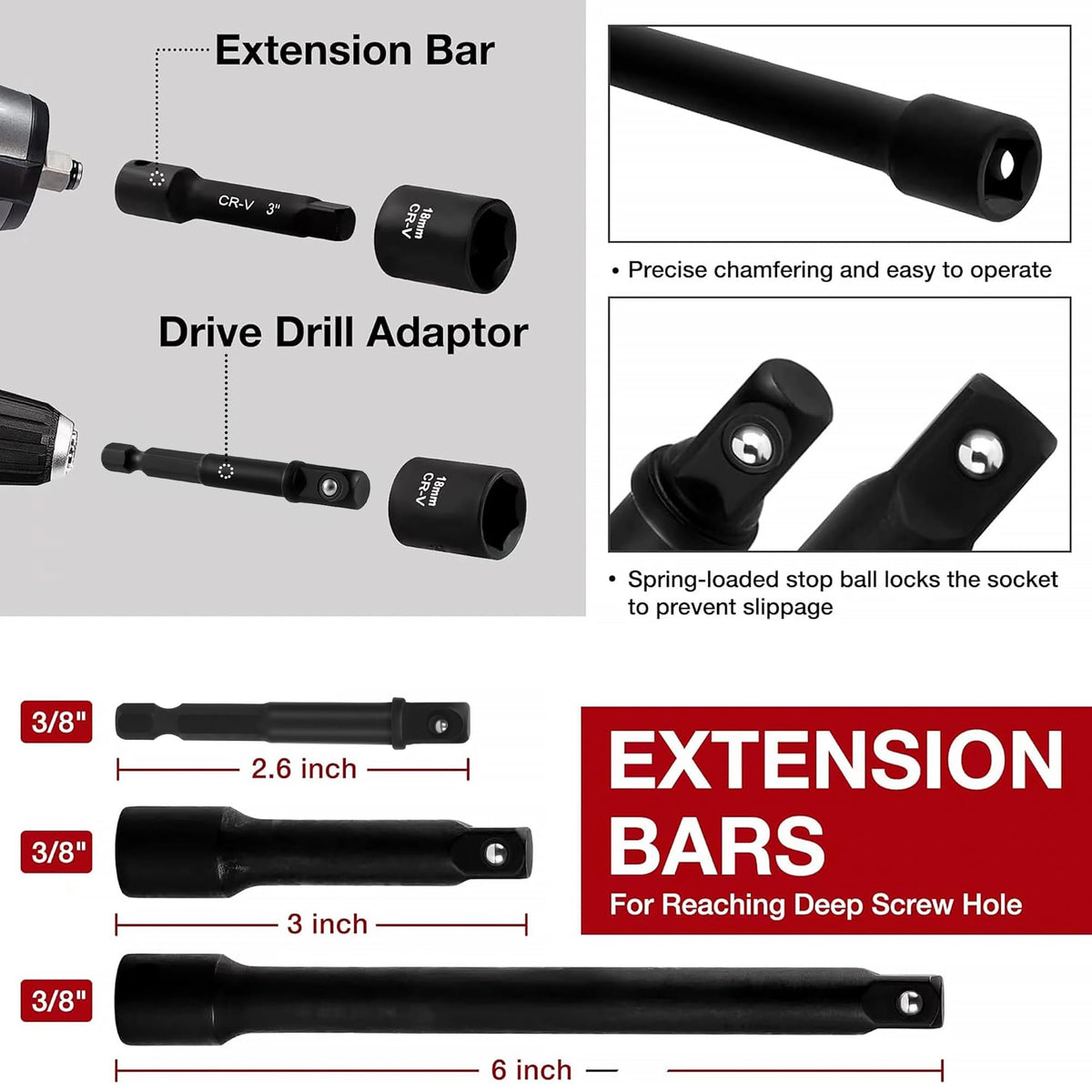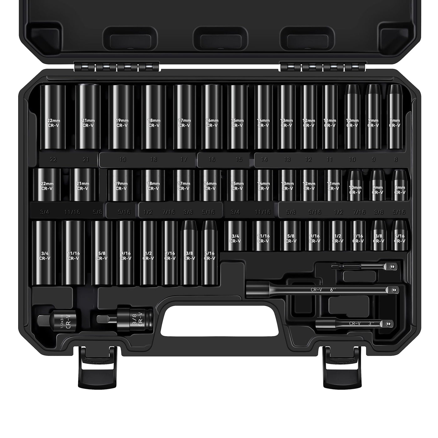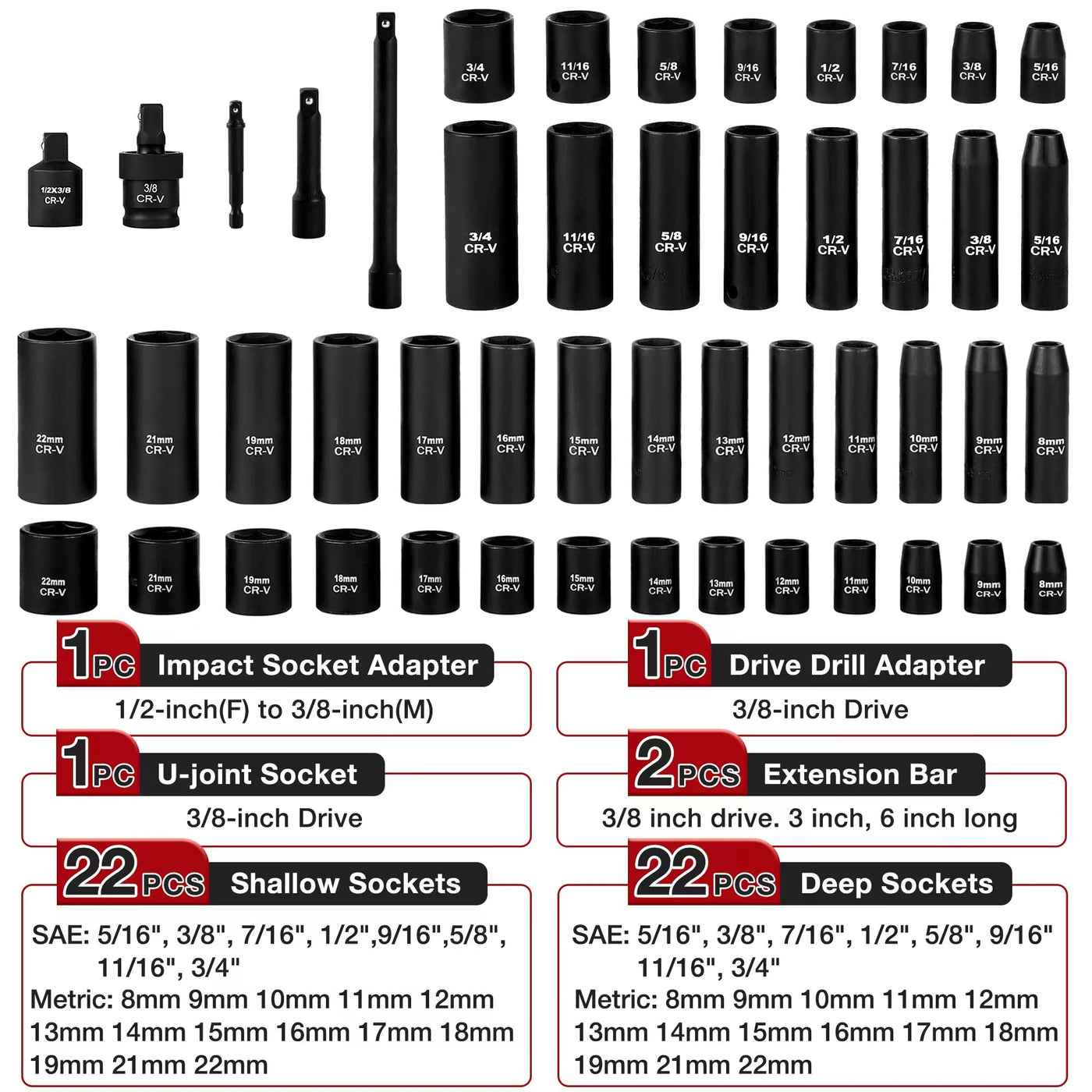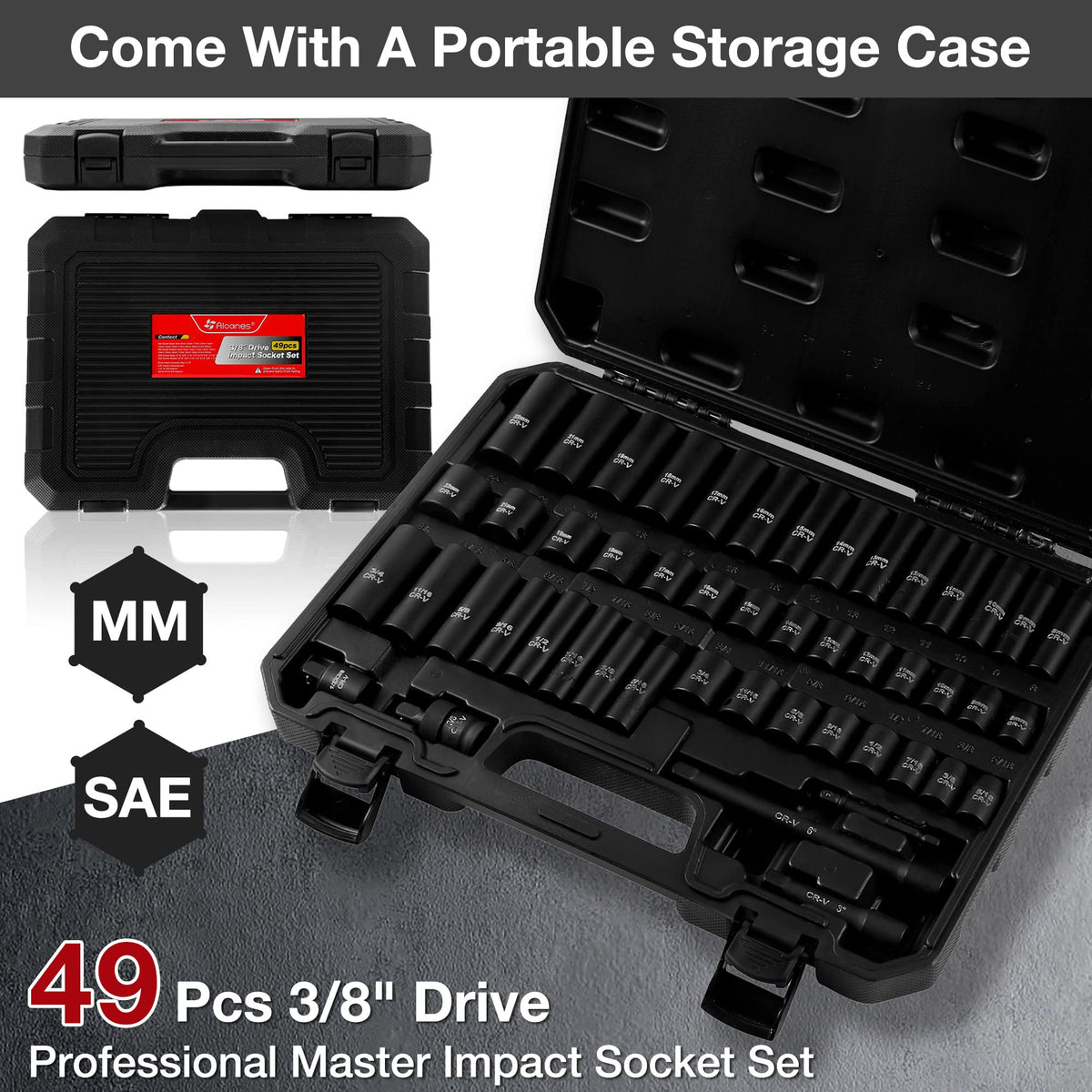Aloanes 49 Pc 3/8-Inch Drive Impact Socket Set, 6 Point, Sae (5/16'-3/4') & Metric (8Mm-22Mm), Deep&Standard, Extension Bars, Drill Adaptor, Universal Joint, 1/2' F To 3/8' M Reducer