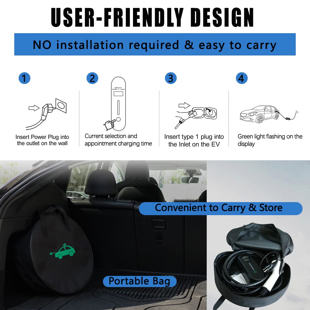 This portable EV charger with NEMA 14-50Plug is compatible with almost all home sockets and offers a Level 2 EV charger (90-256V) for all electric vehicles that meet the SAEJ1772 connector standard. The charging cable is compatible with all electric cars and plug-in hybrids. It's perfect for people who own multiple electric cars, or have parking lots to charge their electric cars. Portable electric car charger offering up to 40Amp power can help you greatly save charging time, it is not only lightweight, but also has good durability, has passed the CE certification, meets the safety guidelines, has overvoltage, overheating, overcurrent protection and other features. LEDdisplay related information, such as actual charging voltage, actual charging power, actual charging amperage, etc. Charger ampere adjustable: 13A/16A/24A/32A/40A,you can make an appointment to charge after 2/4/6/8 hours, flexible amperage Settings help match your wall circuits. Use a delay start timer to schedule charging to save on power costs and reduce peak loads.The portable package includes easy storage and portability.The EV charger has a total 21 ft extra-long charging cable that fits most driveways or garages,and soft cables can be easily stored even on cold winter days.