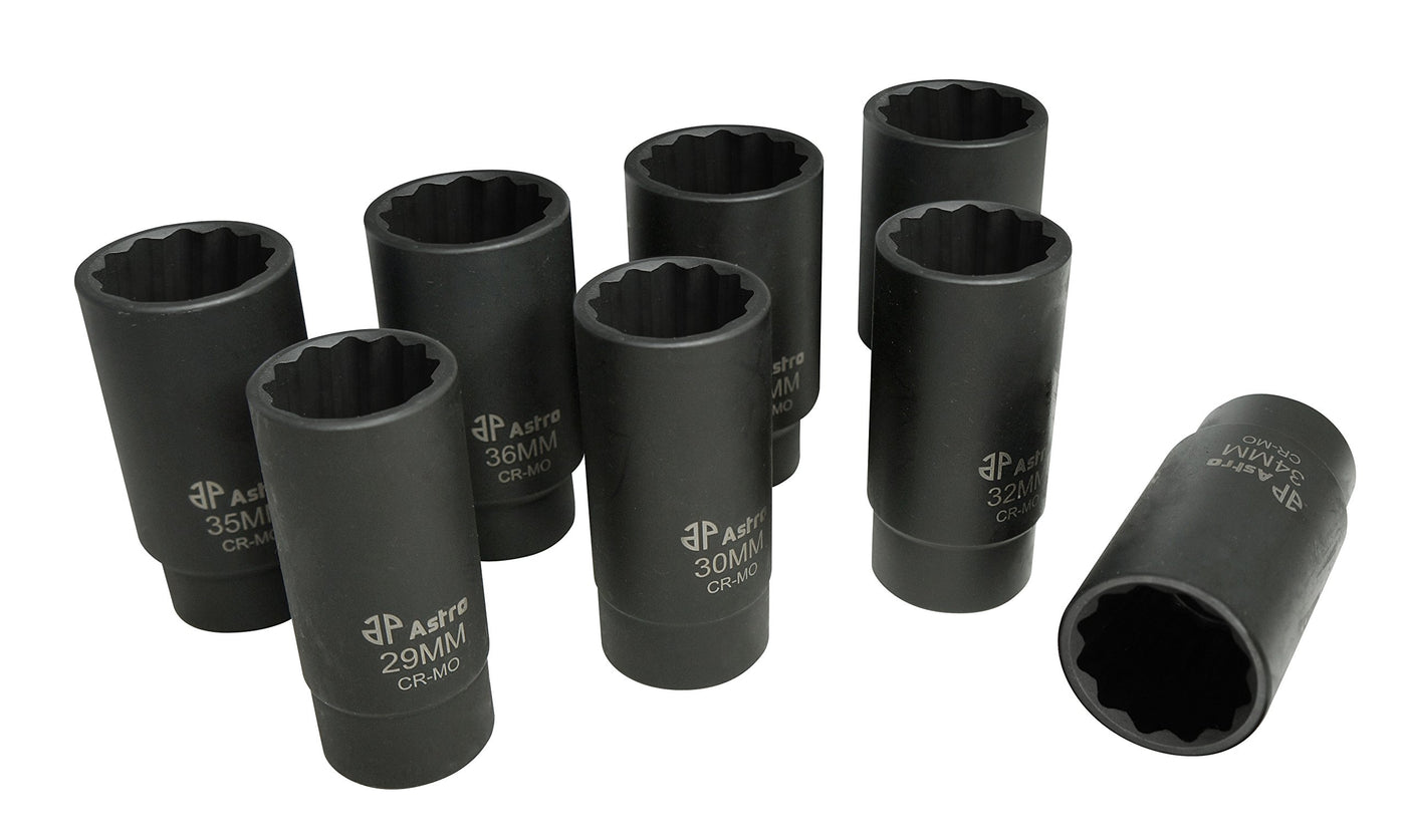 Astro 78868 8pc 12-point axle nut socket set is designed for an exact fit on both 6Pt and 12Pt axle nuts. Set includes a 39mm socket for Toyota/Lexus applications made of extra deep precision Broached and forged from CR-MO with lasting finish..