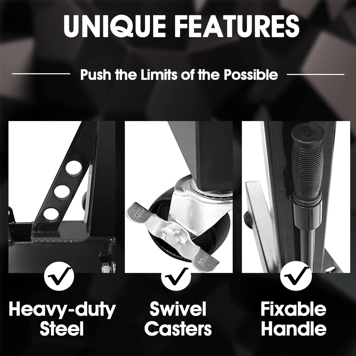 Q: What type of casters does the engine stand have for mobility?A: The engine stand is equipped with two fixed casters and three 360-degree swivel casters, allowing for smooth maneuverability and easy positioning during use.
