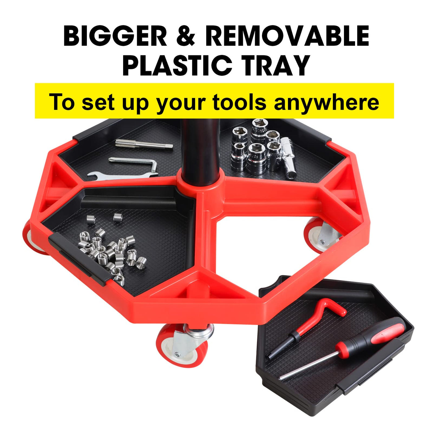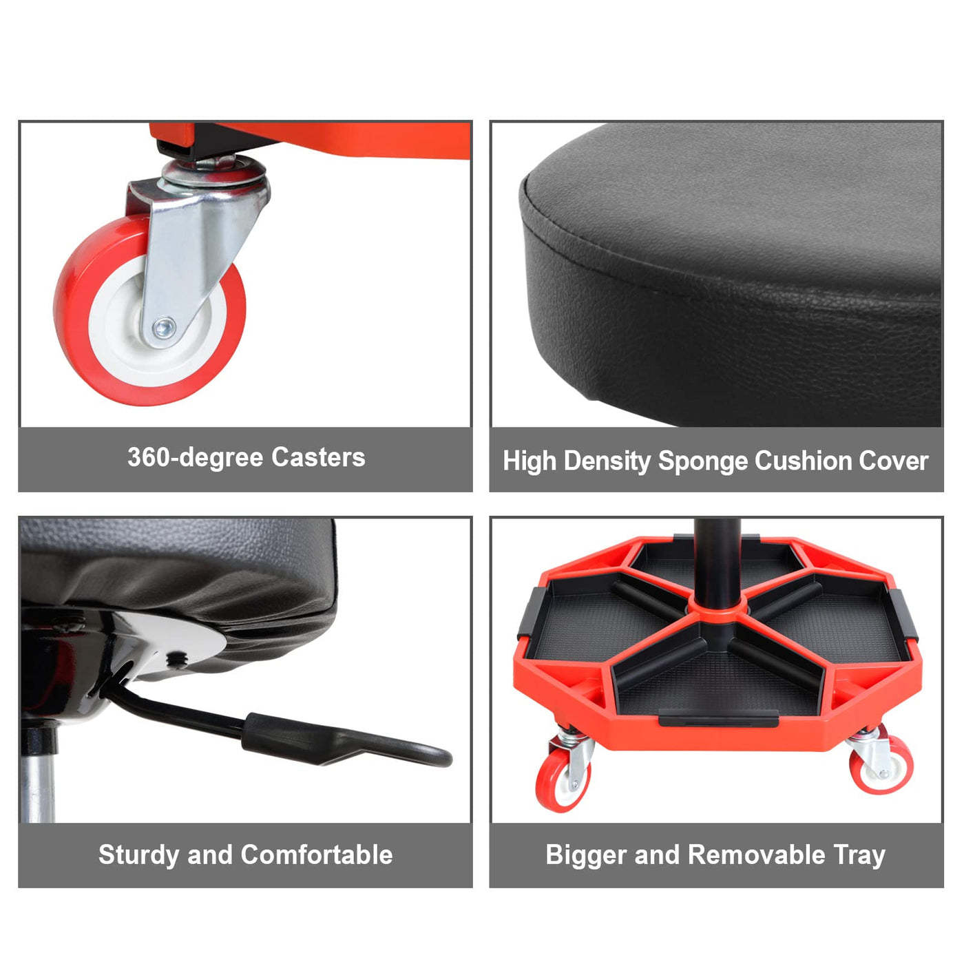 This pneumatic garage rolling shop stool features a four piece plastic removable tool trays demonstrating the new design in the market. This storage tray can be moved away or more near your seat for full ease and position flexibility. The adjustable height can satisfy all your working needs while reducing the stress on your back and knees. It also features a 360 degree caster creating smooth operating seat movements. It's a good partner when working on your car, truck, SUV, van, and more.