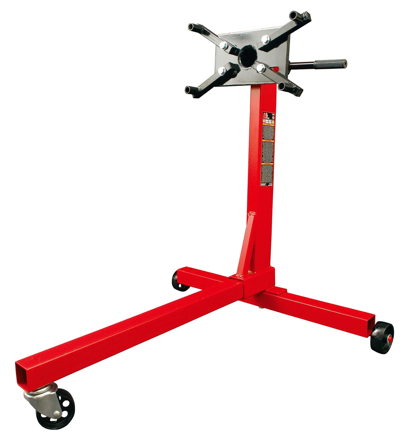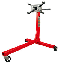 The Torin BIG RED T23401 steel rotating engine stand is constructed with heavy duty steel, providing long term durability with an industrial luster. An extra-wide base provides maximum stability. The mounting head features (4) adjustable arms and 360-degree rotation, allowing for easy access to any part of the engine. It securely holds most foreign and domestic engine blocks. This rotating engine stand features a 3/8 ton (750 lb) load capacity and is equipped with (2) fixed casters and (1) 360-degree swivel caster for smooth maneuverability. A powder coated finish helps deliver rust resistance..