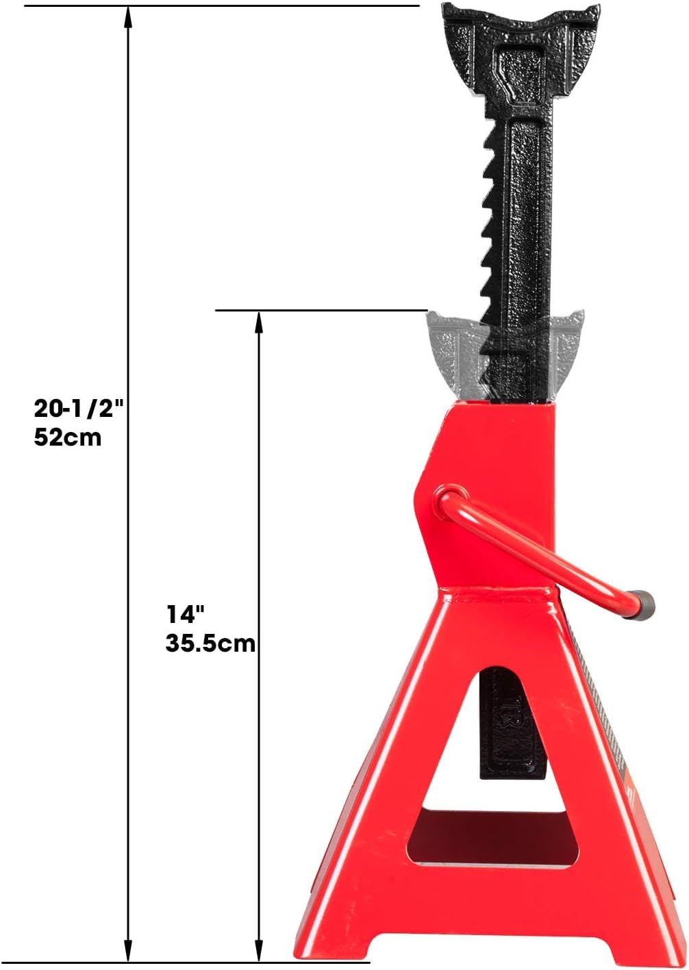 The Torin Big Red steel jack stands for SUV's with extended height are a must have necessity in your garage. The 3 Ton (6,000 lb) capacity jacks are sold as a pair, help support your vehicle and are designed and dedicated to keeping you safe. The extra tall stands have a lifting range of 14' to 20-1/2' that allow for higher clearance lite duty vehicles such as jeeps, SUV's, and UTV's. Locking rack and pawl gives the security and stability where you need it the most. The large saddle surface area provides better contact with the load being supported and the single piece, self-locking, multi-position, forged iron ratchet bar provides precise adjustments. Constructed of high-grade steel with a welded frame, these stands are built for quality and durability. This unit is factory tested to meet ASME safety standards and includes a limited 1 year manufacturer warranty.