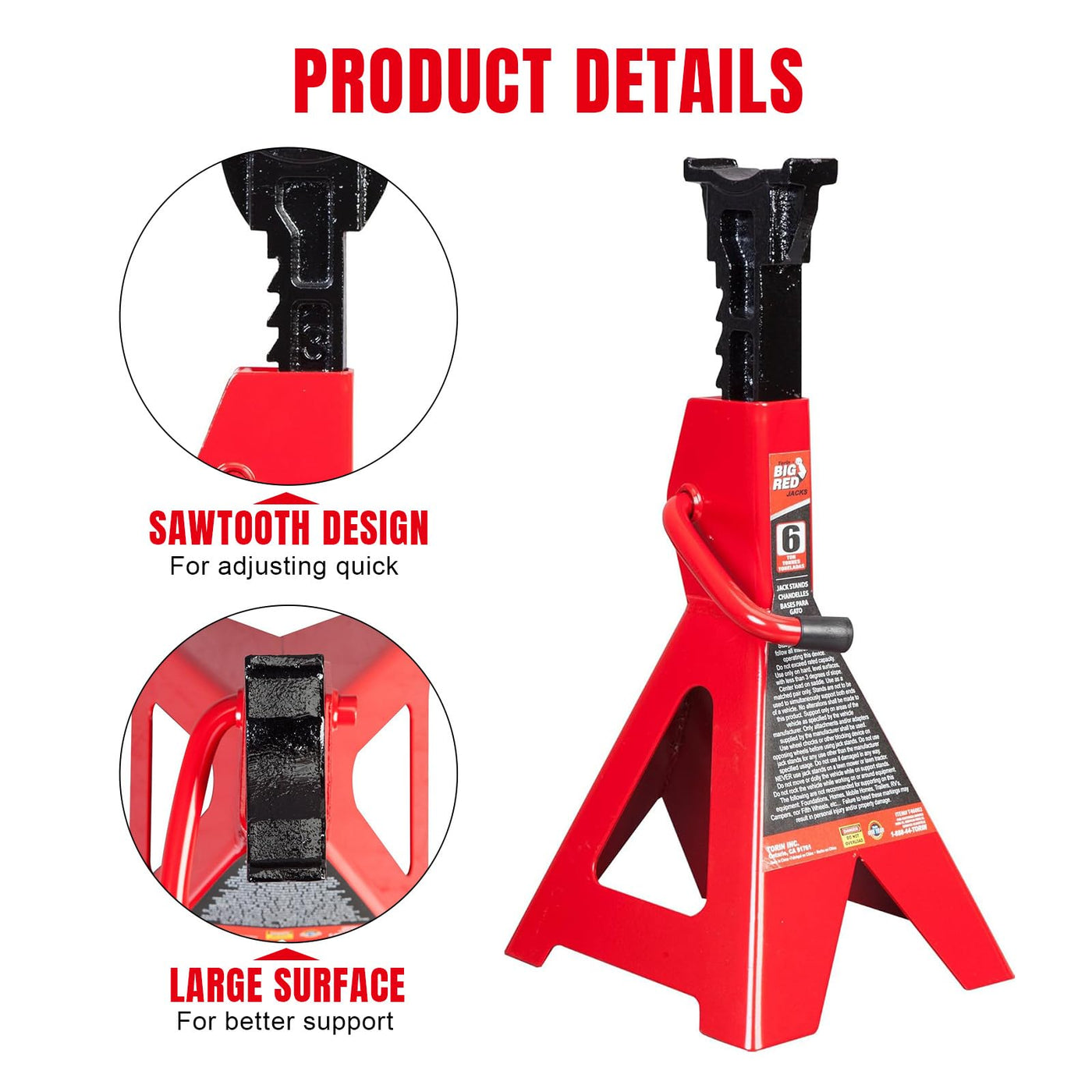 The Torin BIG RED T46202 lightweight jack stands are used to support your vehicle after lifting with a jack. Constructed of high-grade forged steel with a welded frame design for durability, it handles a wide range of vehicles including small cars, SUVs, and light duty trucks. Adjustable height ranges from 15-3/8' to 23-13/16' with a 6 ton (12,000 lb) load capacity. Multi-position ratchet bar has a sawtooth design, allowing for quick height adjustments that lock into place. It features a large saddle surface area for better contact with the load being supported. A wide pyramid foot base provides added strength and stable support. Tested for reliability and safety to meet ASME standards. Includes a limited 1 year manufacturer warranty.