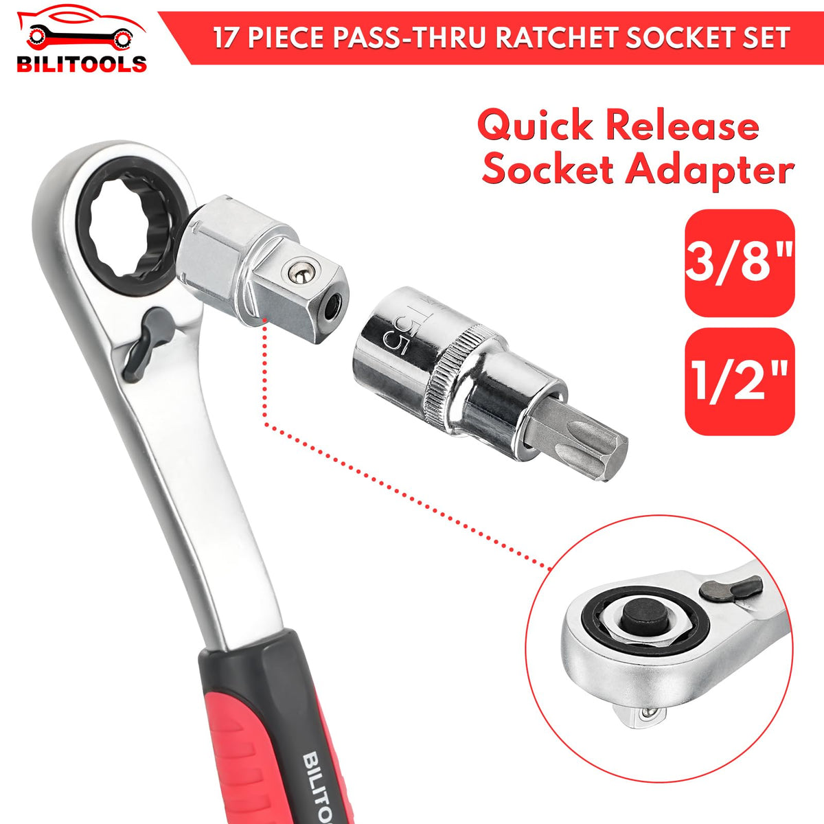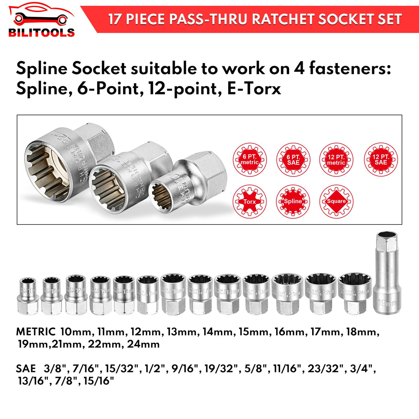 Bilitools 17-Piece Pass Through Socket Set, 3/8' & 1/2' Dr. Universal Pass Thru Go Through Ratchet Socket Wrench Mechanics Tool Set For Hex, Square, E-Torx, Spline Fasteners