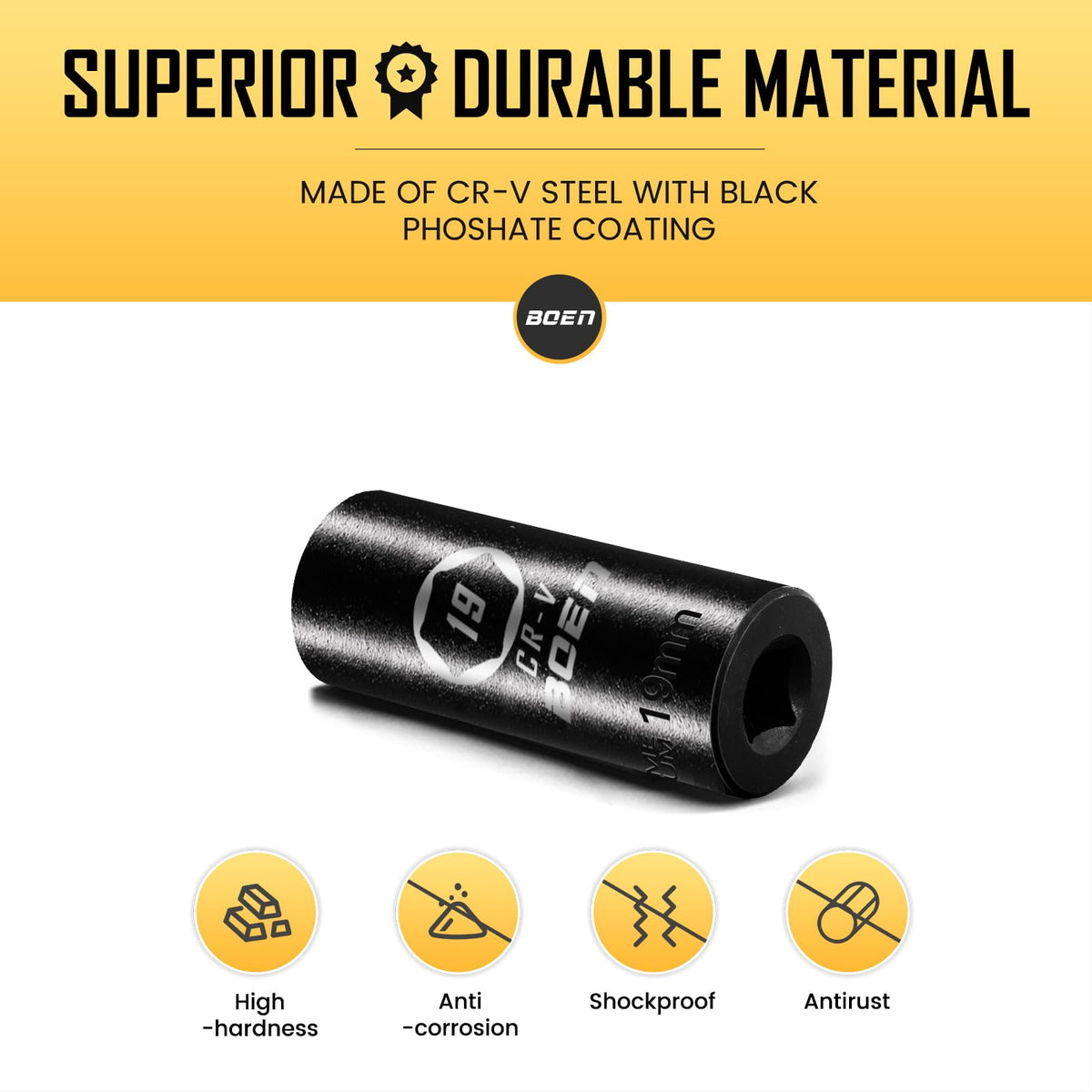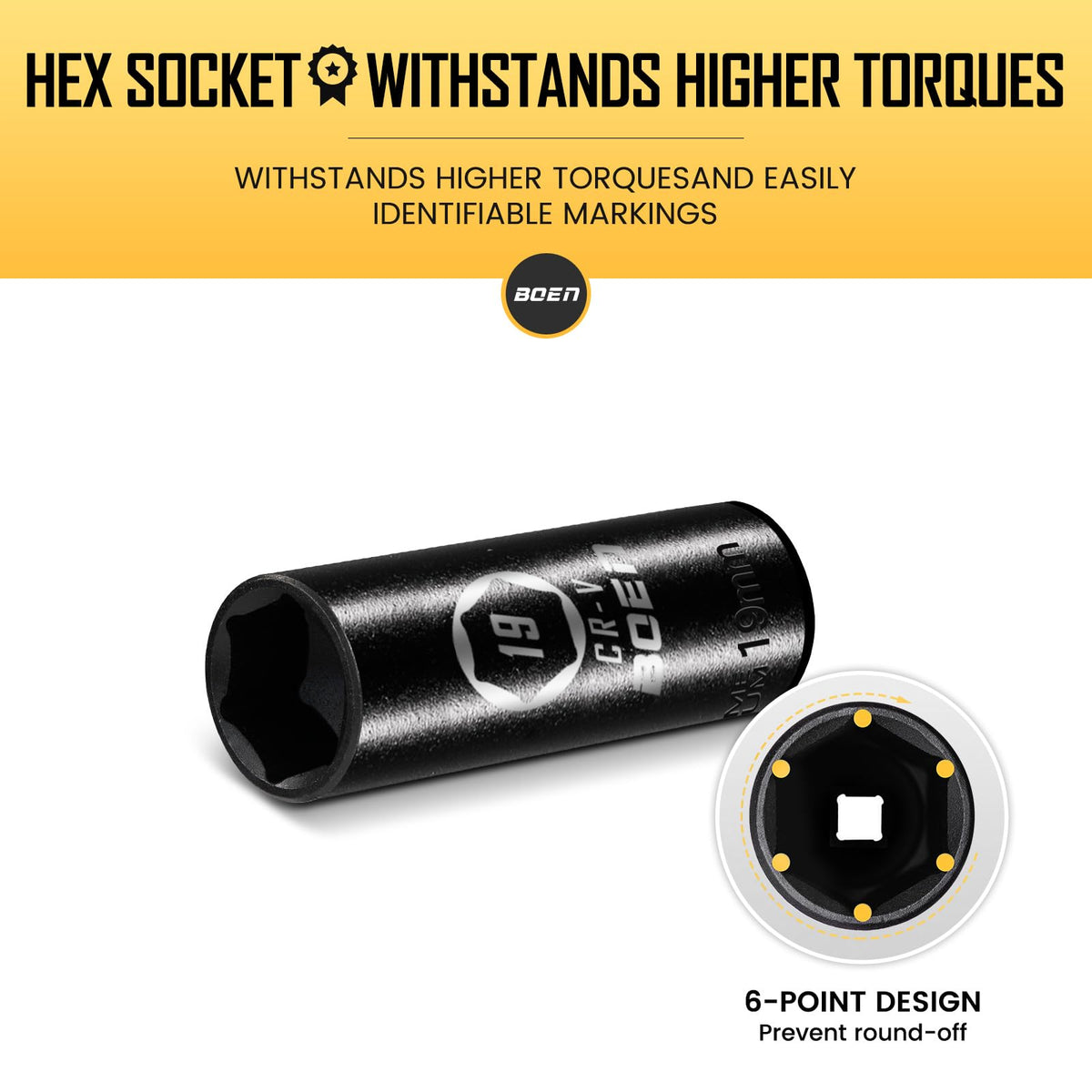 BOEN 1/2' Drive Deep Impact Sockets,Premium Impact Socket,19mm Socket,Metric,6 Point,Cr-V Steel with Laser Marking - Strong and Durable