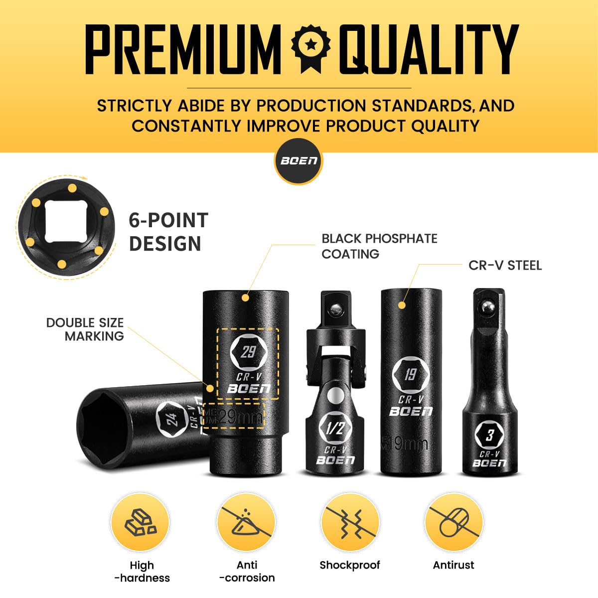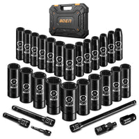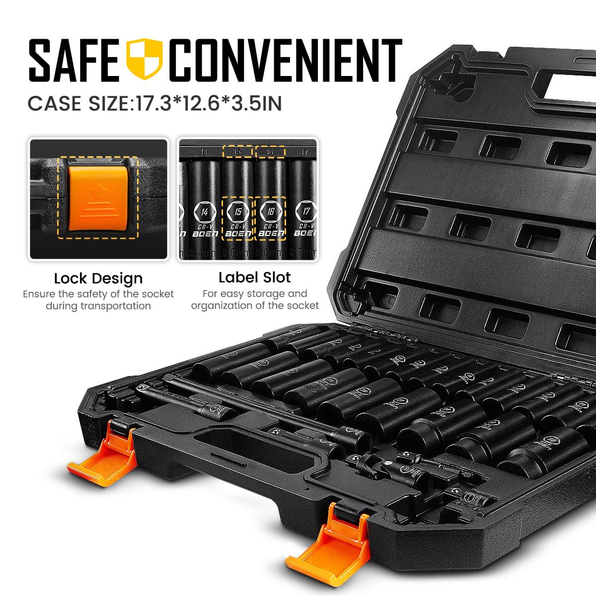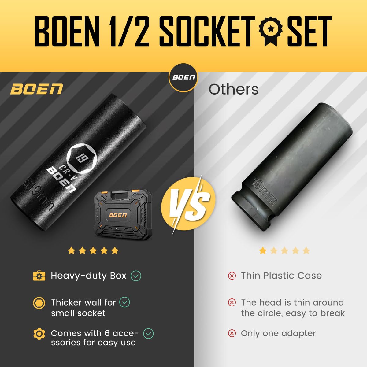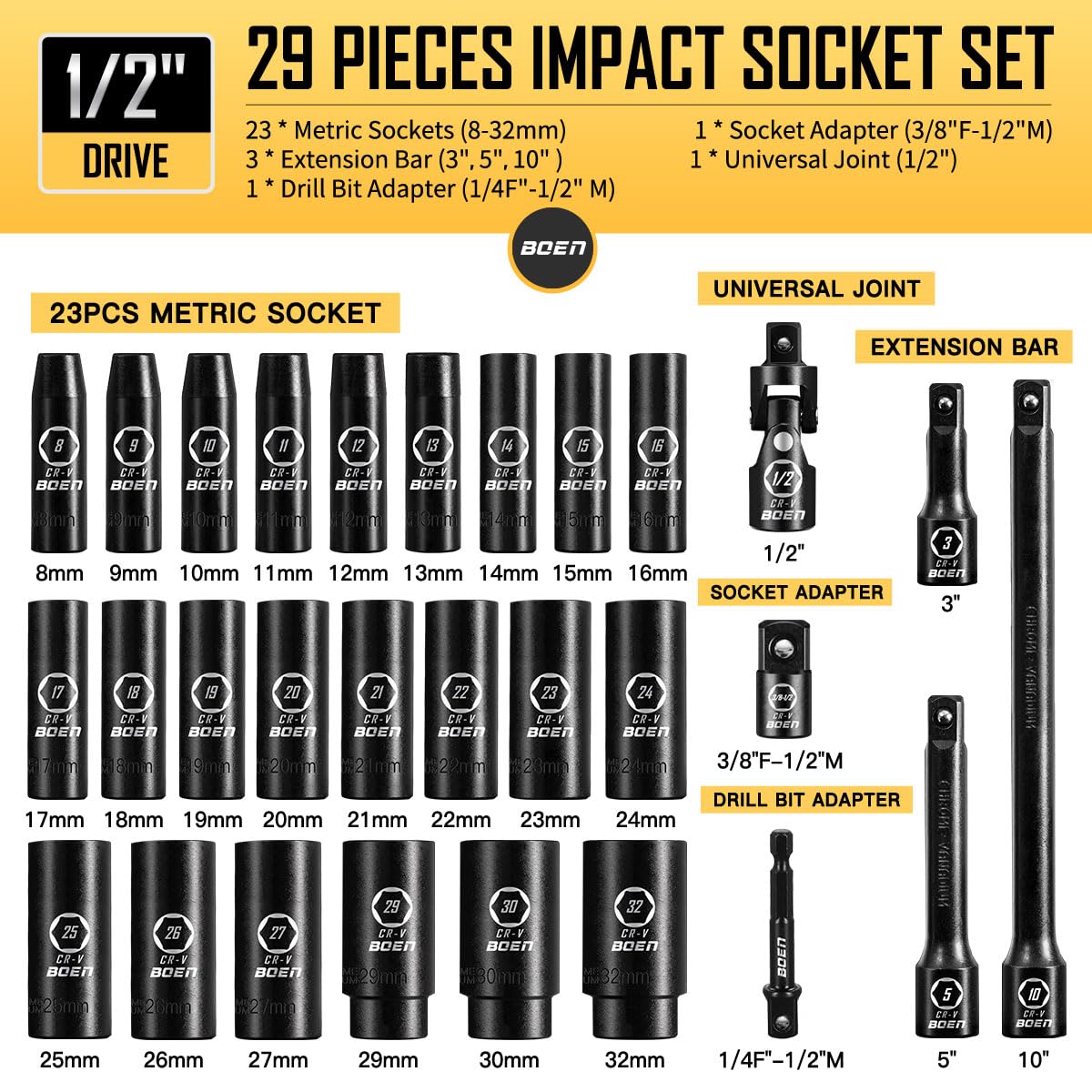 boen 8mm-32mm 1/2” Drive Metric Socket Set, Impact Deep Socket, 6 Point Lug Nut Socket for Auto Repair with Portable Case, CR-V Steel, 29PCS