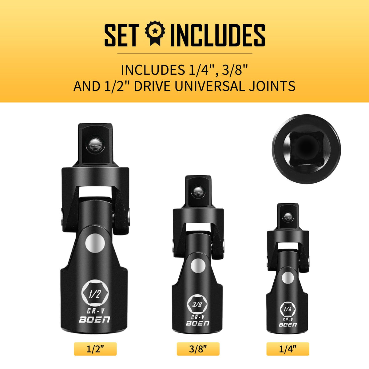 Q: What sizes are included in the BOEN Universal Joint Socket Adapter Set?A: The BOEN Universal Joint Socket Adapter Set includes three different sizes: 1/4 inch, 3/8 inch, and 1/2 inch. This variety ensures compatibility with a wide range of tools.