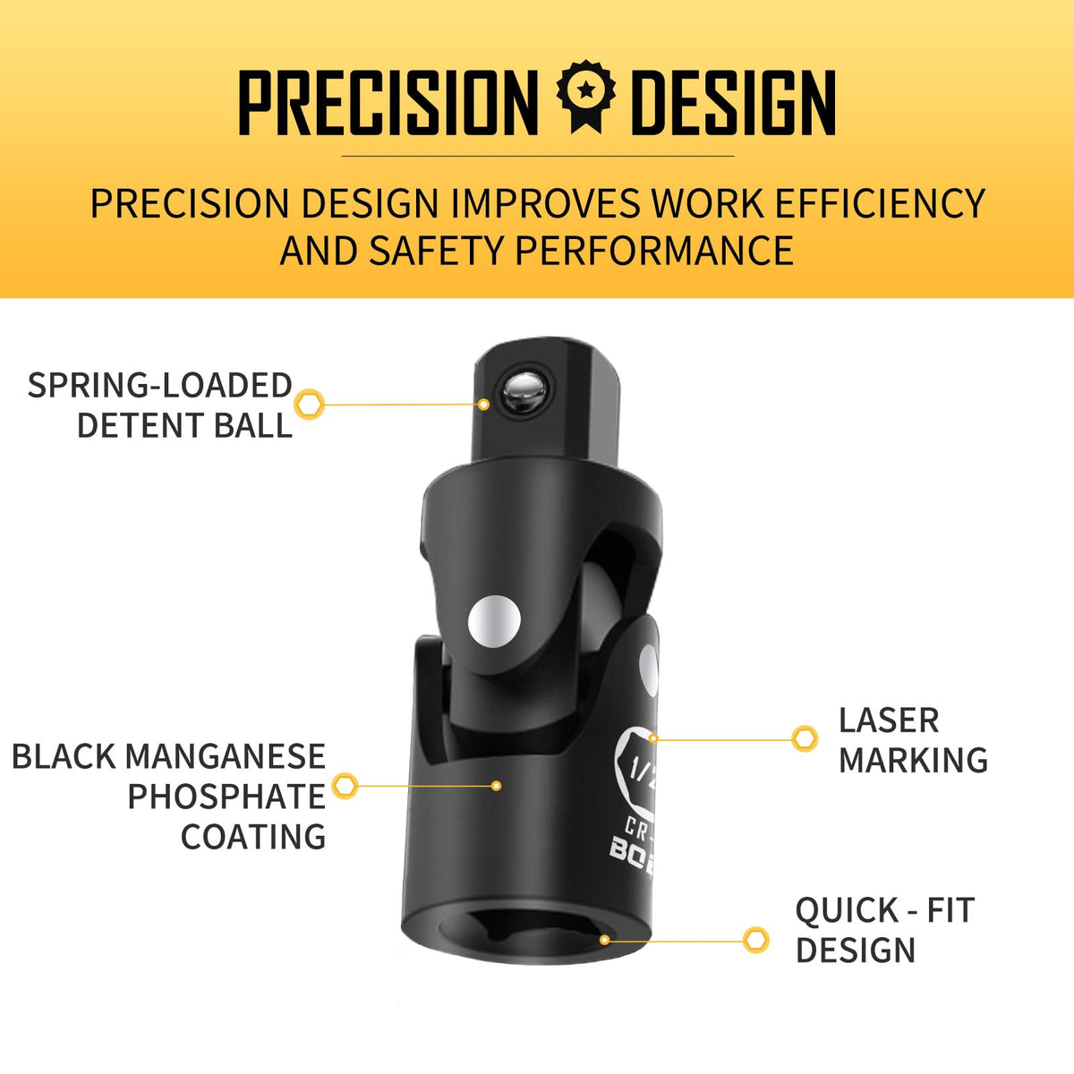 ??High-Quality Material?These universal joints are made of Cr-V steel and feature a durable, corrosion-resistant black oxide surface. The device is structurally robust, ensuring a longer lifespan. | ??Package Include?This set of universal joint drive end sizes are 1/4 inch, 3/8 inch, and 1/2 inch. They have undergone precise machining, conforming to and exceeding ANSI standards. They are suitable for any compatible tool. | ??Precision Design?The spring-loaded locking ball secures the universal joint firmly in the groove of the socket set or extended pole, ensuring a more reliable and secure connection, minimizing the risk of detachment, and enhancing work efficiency. | ??Upgrade optimization? We have optimized the structure of the universal joint, allowing it to achieve a maximum bending angle of nearly 90°. Therefore, it is more suitable for operation in narrow spaces, efficiently solving your problems. | ??Quality Assurance?Each U-Joint socket in this kit is equipped with easy-to-read size markings, allowing for quick and easy identification even in dim lighting conditions, ensuring efficient work. We provide a 1 year quality guarantee. If you have any questions, please feel free to contact us.