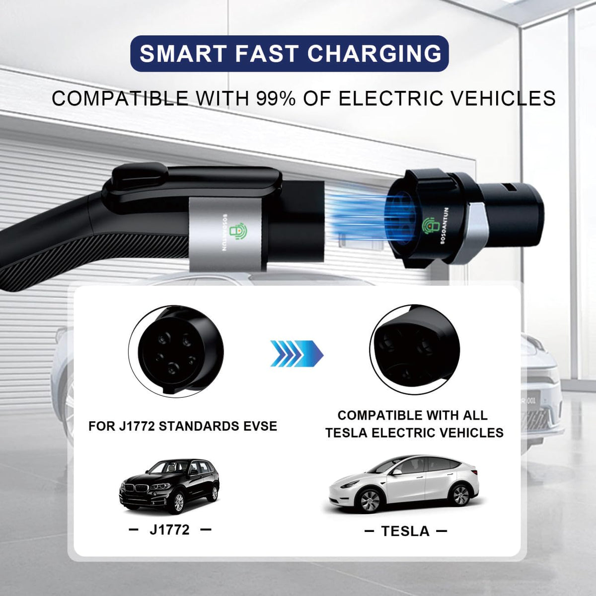 Q: Is this charger compatible with Tesla models?A: Yes, this charger is compatible with Tesla vehicles and includes a J1772 to Tesla adapter in the package, making it suitable for both Tesla and J1772 electric cars.