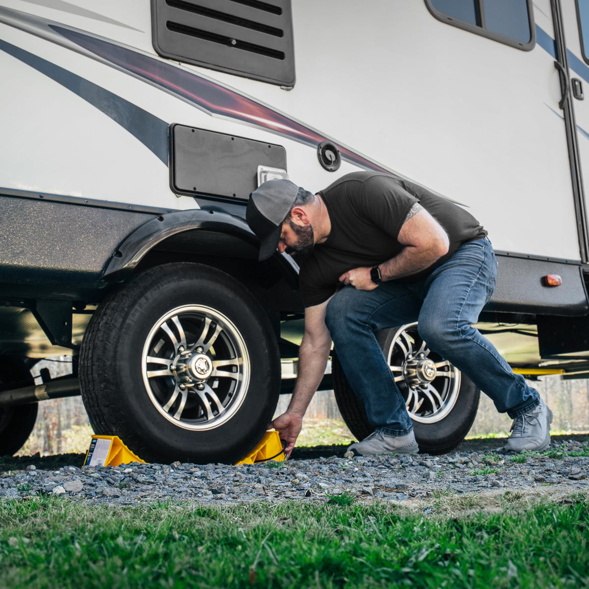 Q: How do Camco Wheel Chocks help keep my trailer stable?A: Camco Wheel Chocks are designed to provide reliable stability for your trailer or RV, ensuring that it stays securely in place, even on uneven surfaces. This allows you to re-hitch your vehicle with confidence, free from concerns about unwanted movement.