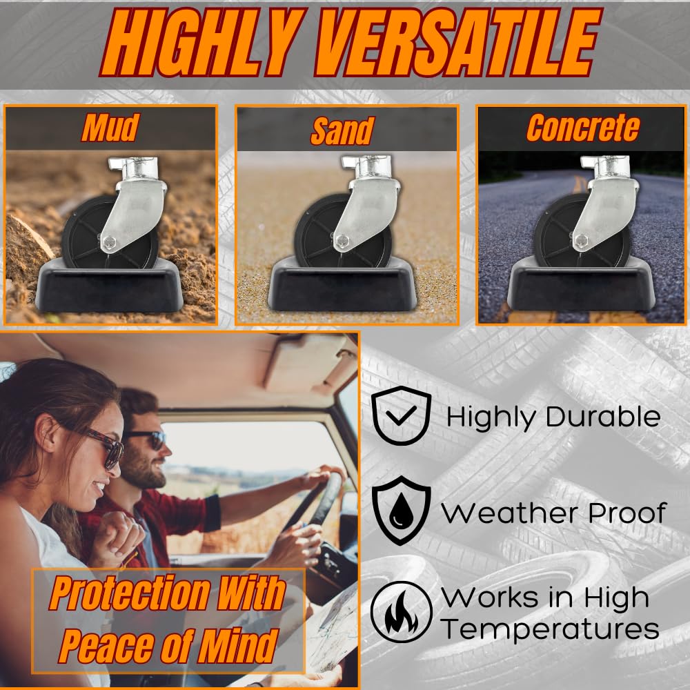 Q: What material is the Caravanture Jack Caster Wheel Dock made from?A: The Caravanture Jack Caster Wheel Dock is made from tough anti-slip rubber, which is designed to withstand heavy use and environmental conditions. This durable material ensures that the dock remains effective for years to come.