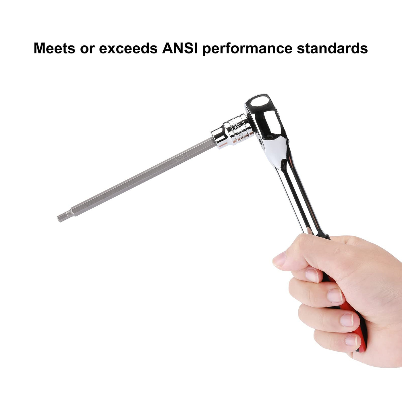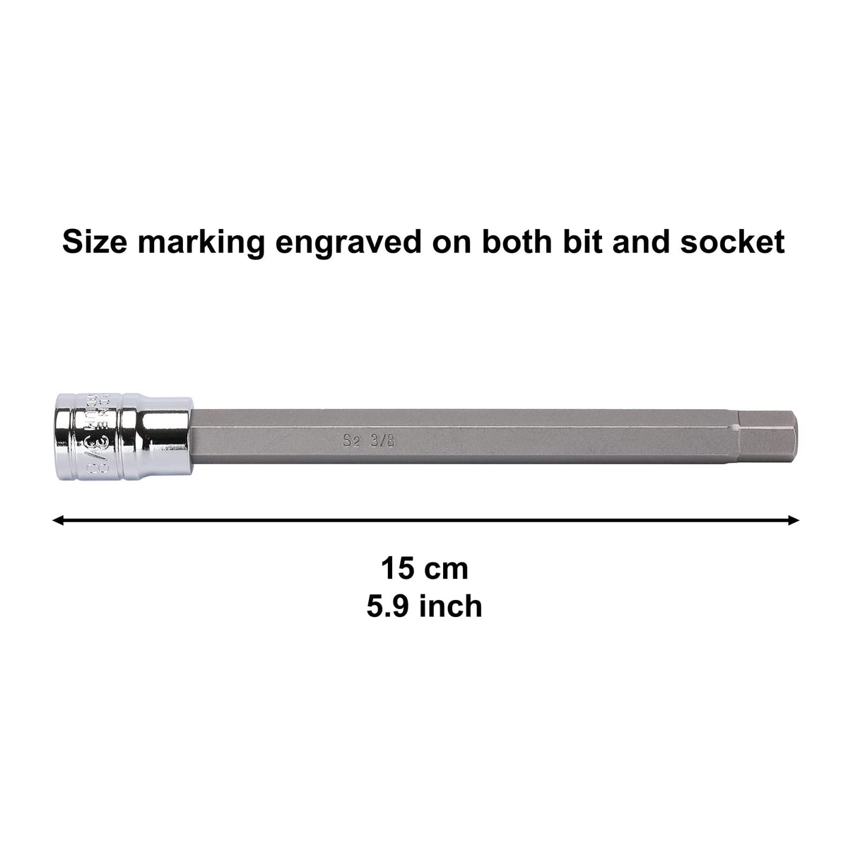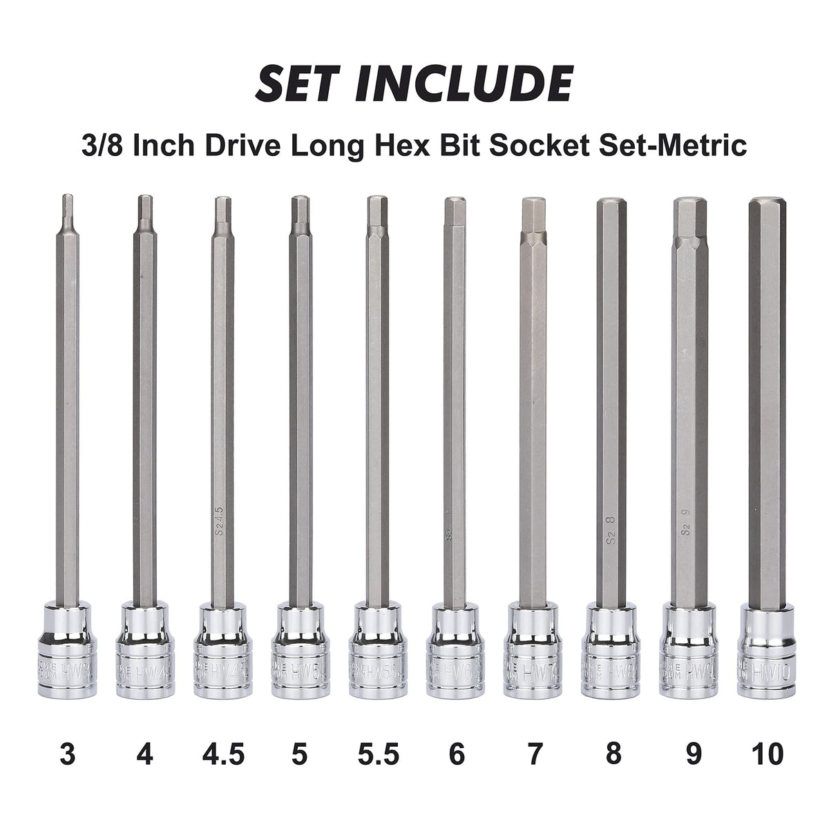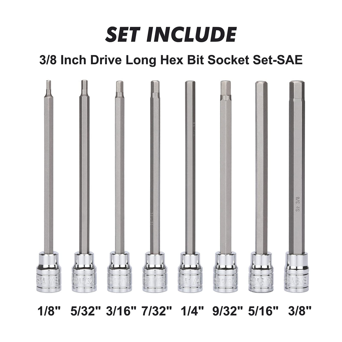CASOMAN 18 Pieces 3/8 Inch Drive Long Hex Bit Socket Set made of premium S2 alloy steel for superior hardness and insure longevity,Cr-V steel sockets provide superior torque for greater turning power. Extra-long design allow bit to reach deep into especially narrow, recessed areas. Insert smoothly with precision chamfered bit ends. Large, clear die-stamped size marking is easy to read and can’t wear off. Come with a heavy duty blow molded storage case, easy to carry. Meets or exceeds ANSI performance standards. It comes with 1 year quality warranty.